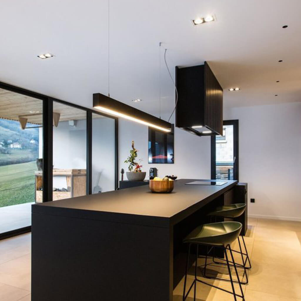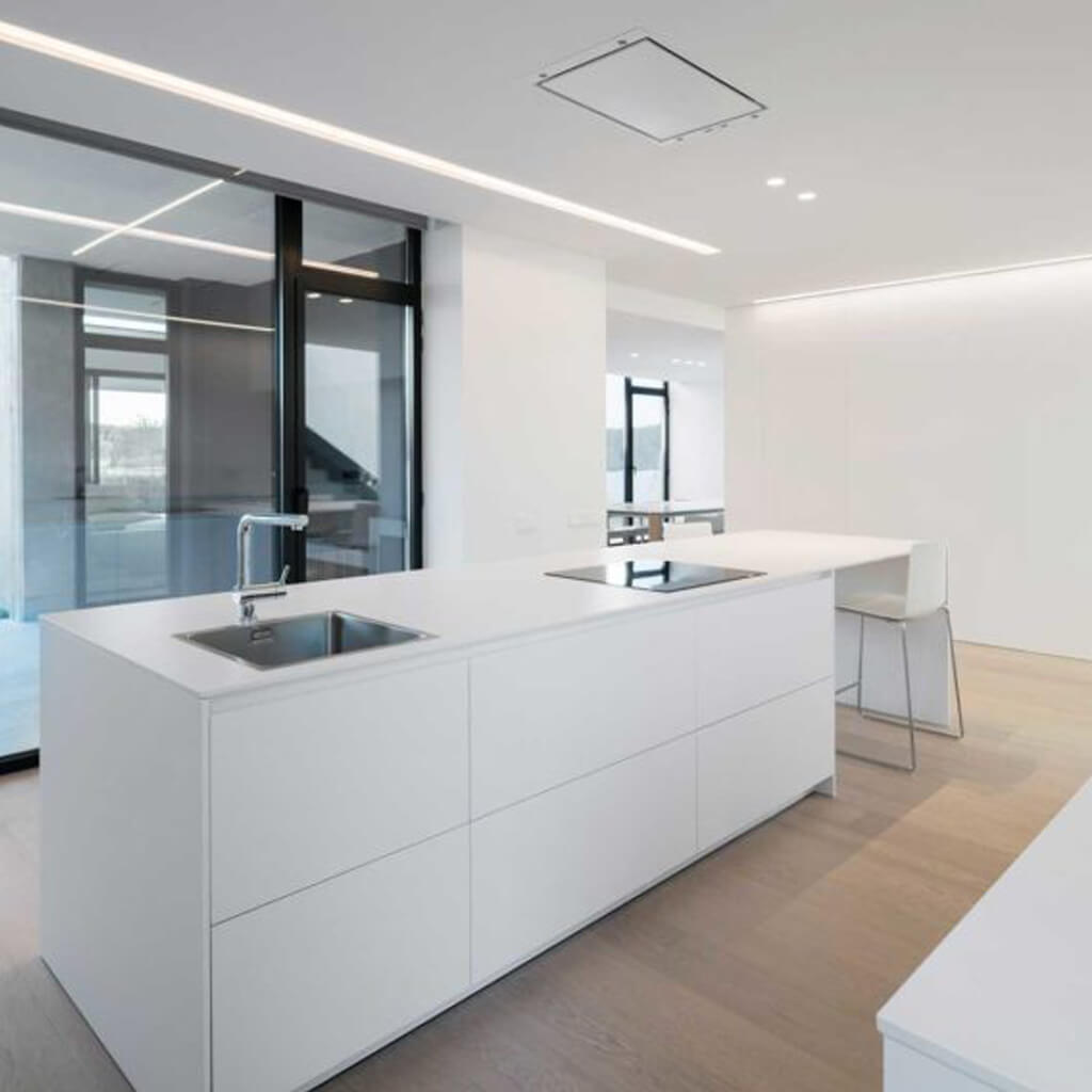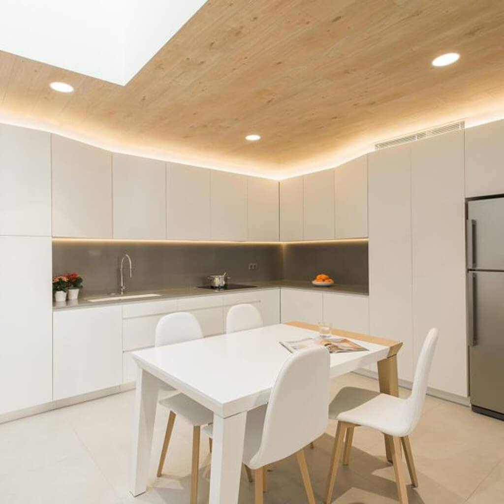 - La iluminación específica: para zonas como la encimera o la zona de la campana donde necesitamos una iluminación más uniforme para poder concinar y limpiar. Podemos utilizar downlights, focos o plafones Led.