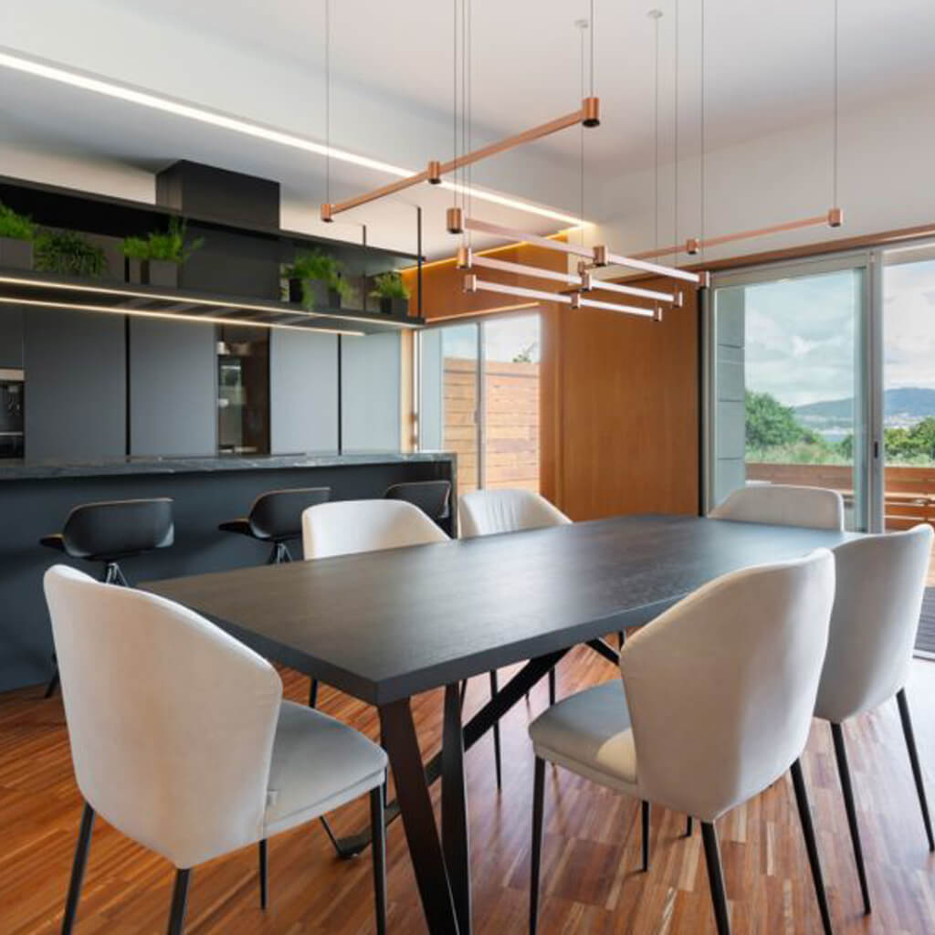 Es un lugar muy versátil en el que podemos cocinar, comer, sentarnos a descansar… por ello es muy importante planificar bien su iluminación en consonancia que la iluminación general. Cuando nos preguntamos cómo iluminar la isla de cocina, podemos optar por lámparas suspendidas encima de la misma, de tal forma que obtengamos iluminación directa, aunque si nuestra isleta ya incluye campana, deberemos combinar nuestras lámparas colgantes con la propia luz de la campana. Si nos buscamos cómo iluminar una barra de cocina, deberemos seguir las mismas recomendaciones, teniendo en cuenta la colocación de las lámparas de forma alargado o circular en función de nuestra barra.