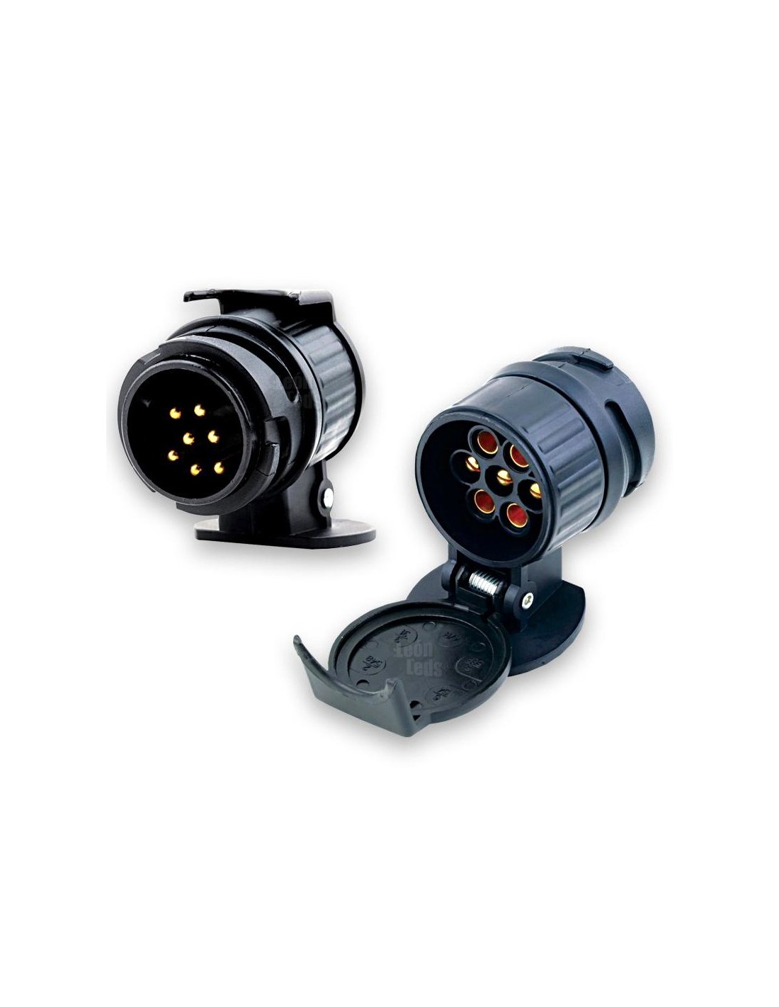 Adapter von 13 Pin auf 7 Pin mit Abdeckung für die Seite des 7-Pin-Steckers, aus hochfestem Polycarbonat hergestellt. Dieses Adaptermodell wird verwendet, wenn das Zugfahrzeug einen 13-Pin-Stecker hat und der Anhänger einen 7-Pin-Stecker.