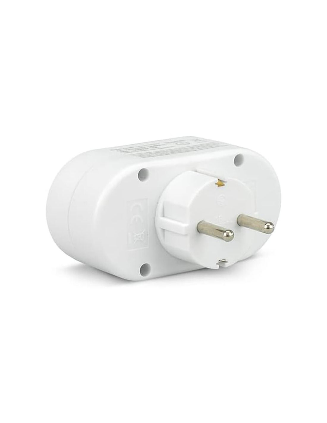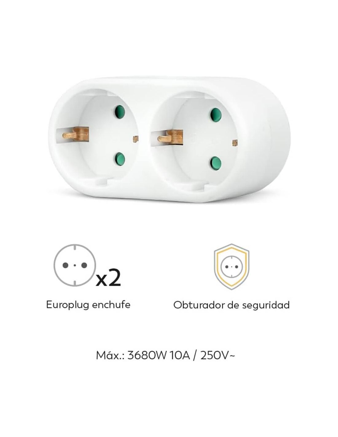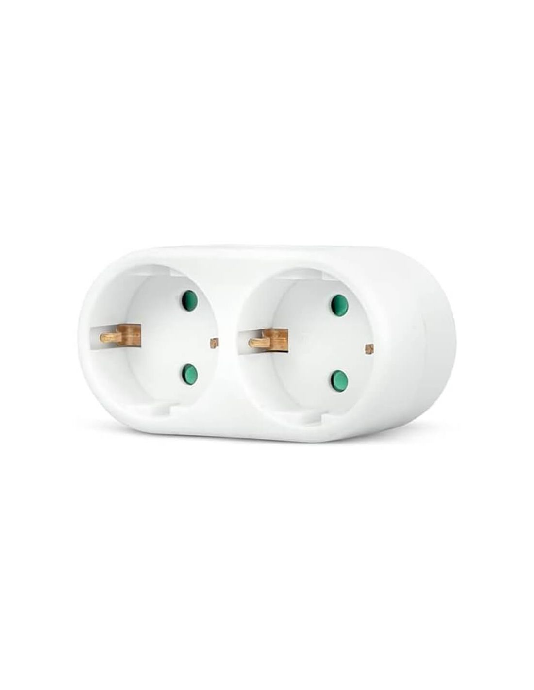 Garza Frontadapter mit 2 Schuko-Steckdosen in Weiß mit integriertem Kinderschutz und Erdung. Mit einer maximalen Leistung von 3680 W (16 A / 230-250 V) ist es ideal, um die Anzahl der Steckdosen einfach zu erhöhen, ohne eine Steckdosenleiste zu verwenden. Kompakt, sicher und funktional, geeignet für den Einsatz in privaten Wohn- oder Büroräumen.