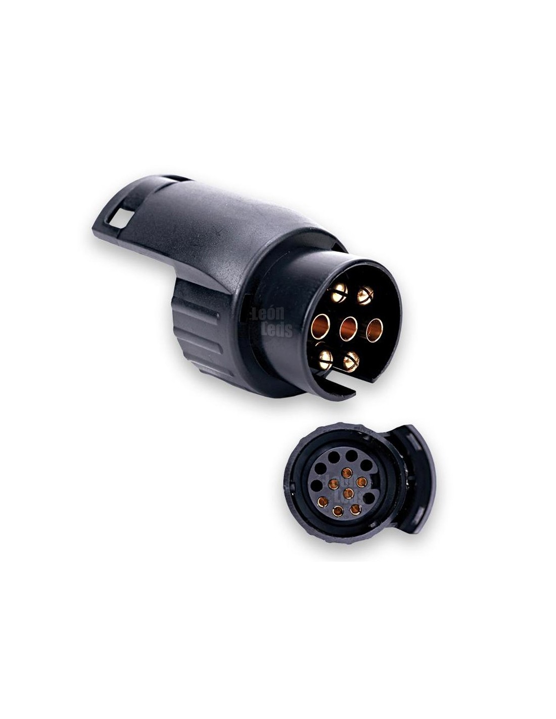 7-poliger zu 13-poliger Adapter für Anhänger, gefertigt aus hochfestem Polycarbonat. Dieses Adaptermodell wird verwendet, wenn wir einen 13-poligen Stecker am Anhänger und eine 7-polige Basis im Fahrzeug haben.