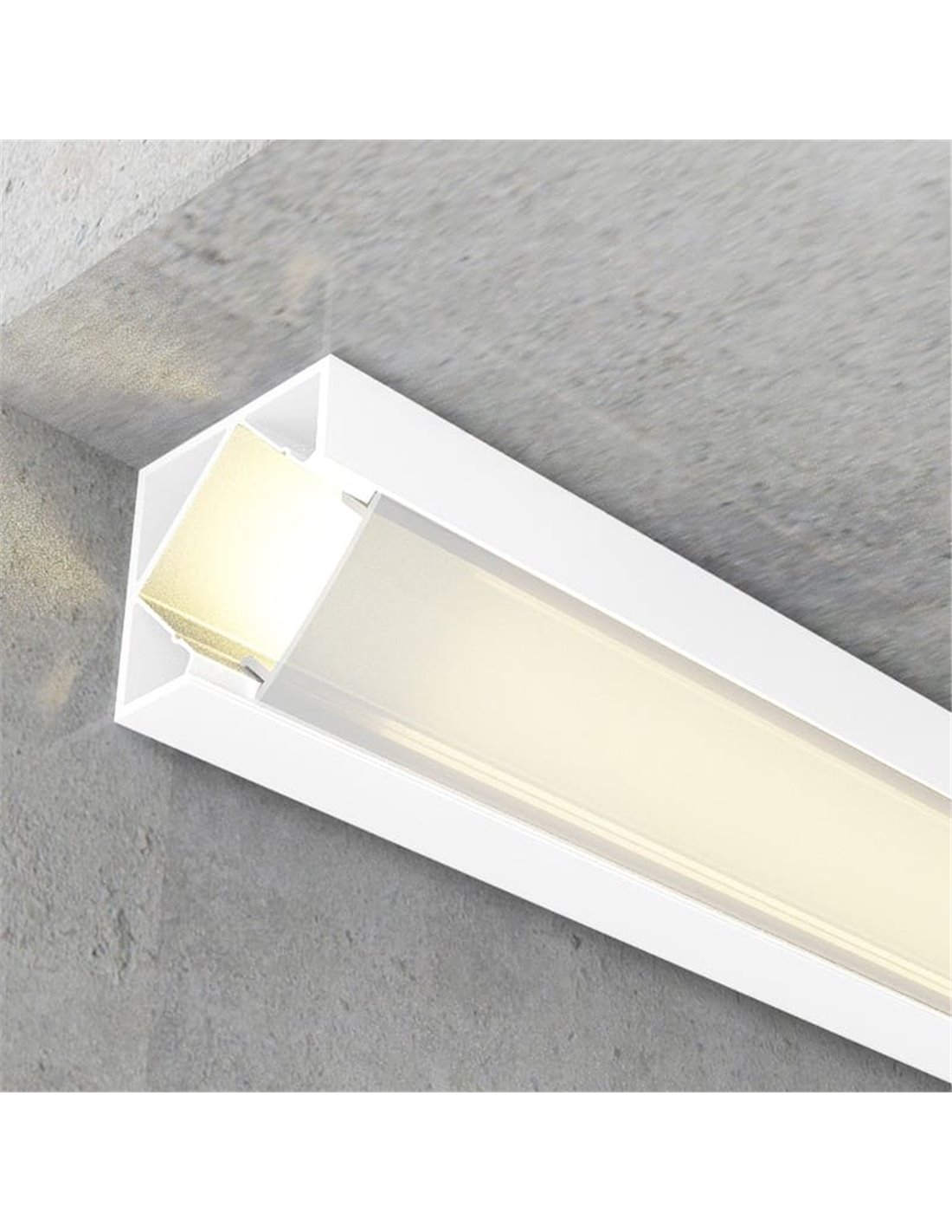 Das Eckprofil aus Aluminium KOPEP in weiß lackiert wurde entwickelt, um LED-Streifen in Ecken mit einer saubereren und weniger invasiven Ästhetik zu integrieren. Es wird vollständig mit Diffusor und Kappen geliefert, ideal für Installationen, bei denen das Profil mit hellen Wänden oder Decken “verschmelzen” soll.
