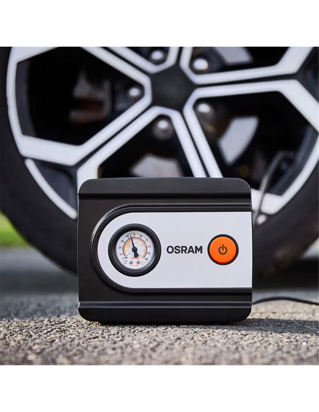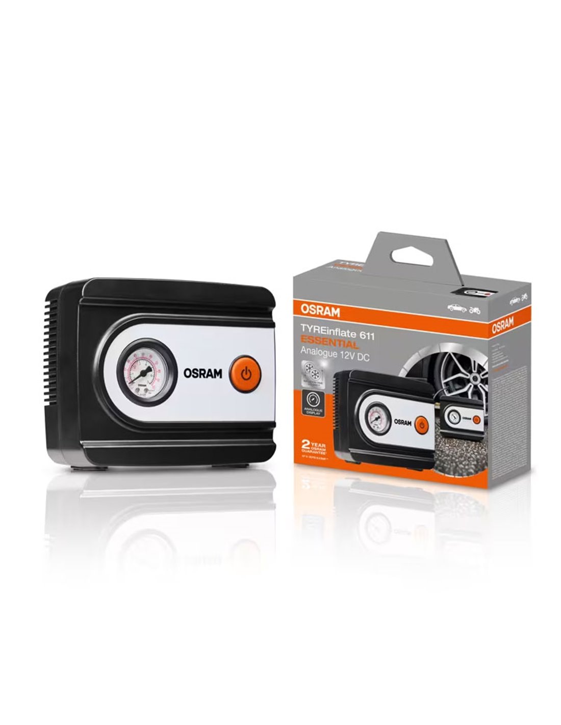 12V OSRAM TYREinflate 611 ESSENTIAL Reifenfüller mit analoger Manometer, 3 m Kabel und 60 cm Schlauch, um bequem alle 4 Reifen zu erreichen. Pumpt einen Standardreifen von 13” in ≈4,5 min auf und erreicht 100 psi / 6,9 bar, mit Anzeige in PSI, bar und kPa. Beinhaltet Set aus 3 Adaptern für Bälle, Fahrräder und Matratzen sowie integriertes Kabelmanagement und Befestigung mit Klettverschluss zur Aufbewahrung ohne Spielraum. Ein-Tasten-Betrieb, kompaktes Design und zuverlässige Leistung, um den richtigen Druck aufrechtzuerhalten und die Lebensdauer des Reifens zu verlängern.