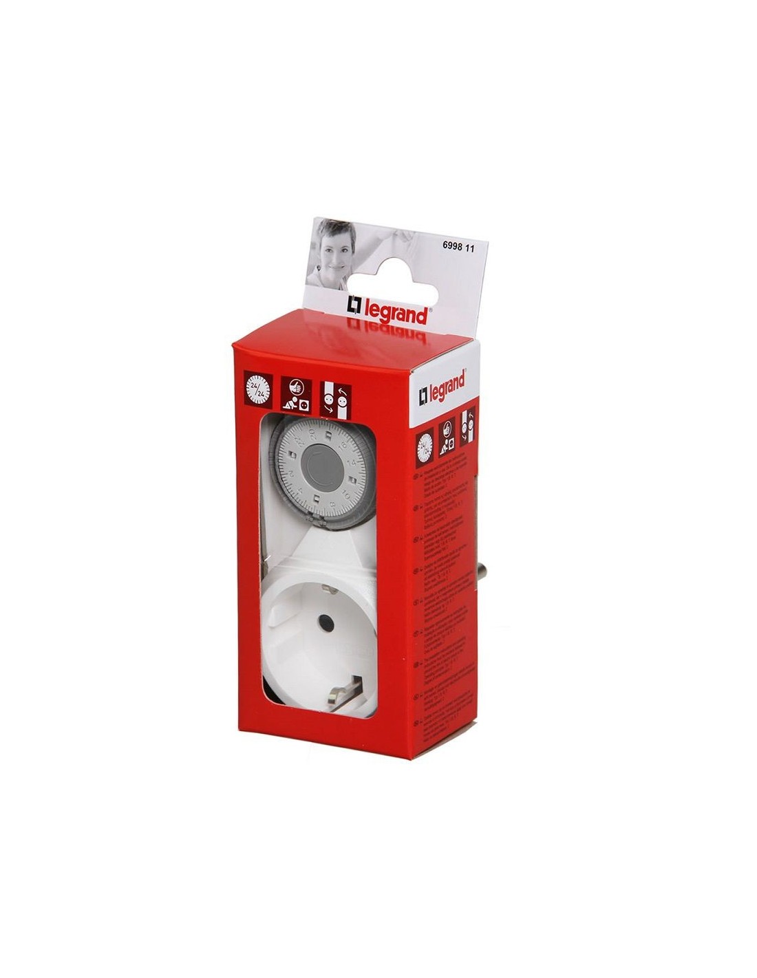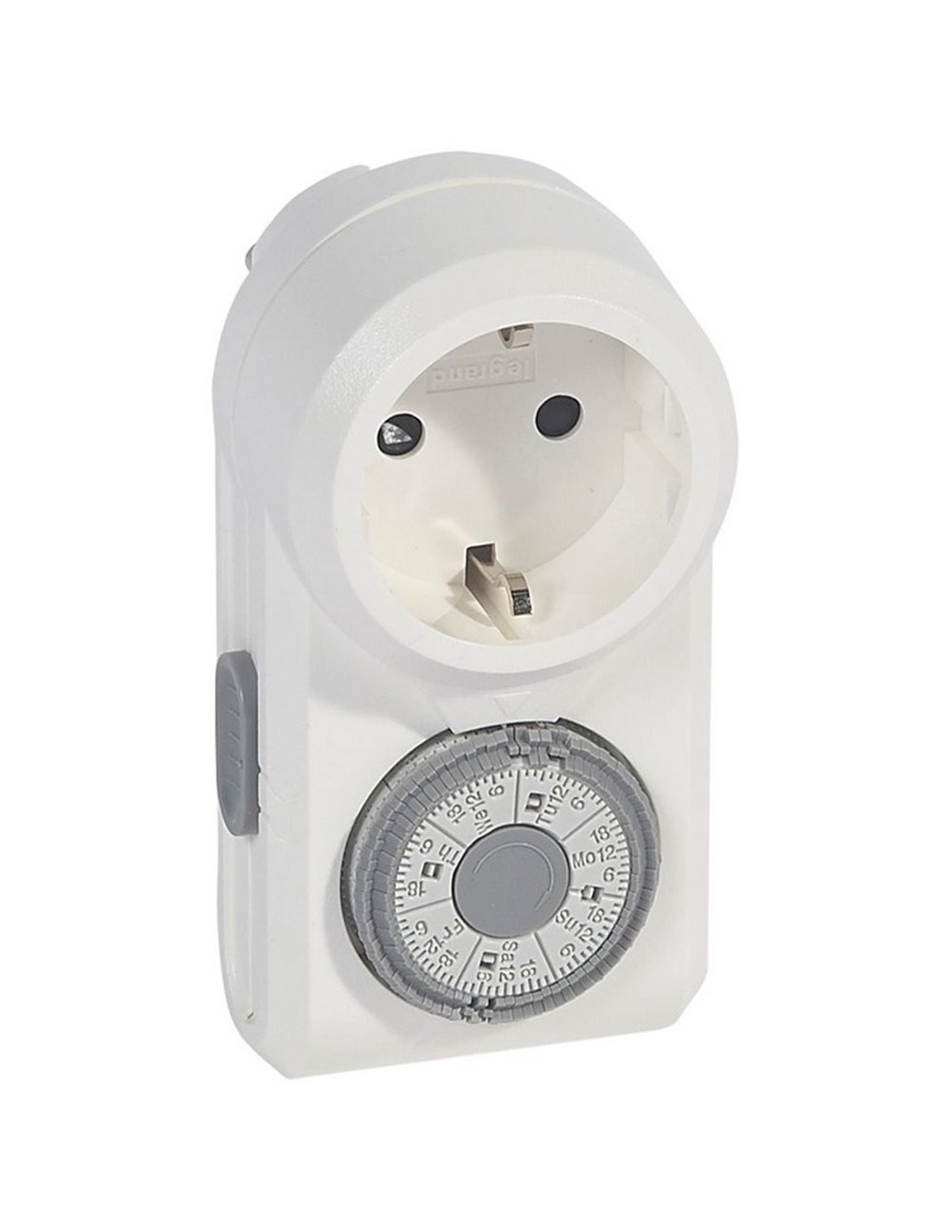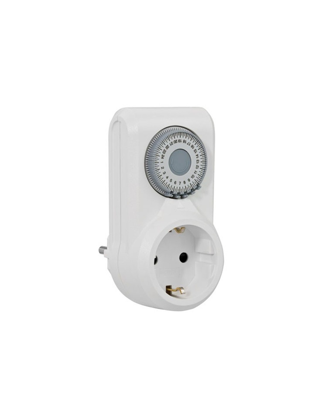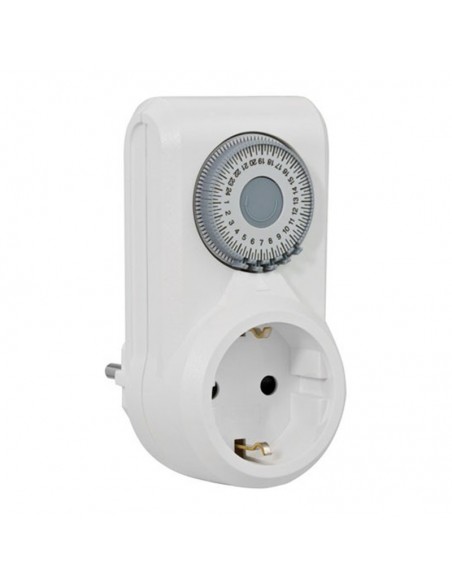 Analoge tägliche Zeitschaltuhr (24 Stunden) für Steckdose, die die Betriebszeiten in einem Mindestzeitraum von 15 Minuten und maximal 24 Stunden einstellen kann, ist von der Marke Legran und das Modell ist Omnirex.