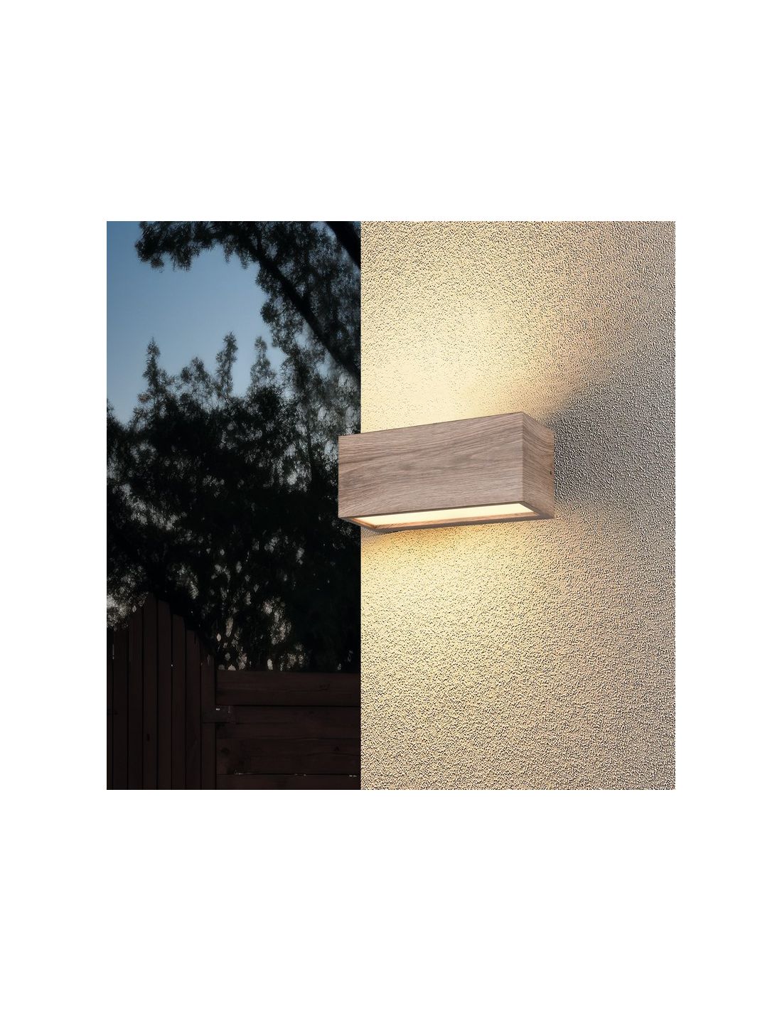 Verwandle deinen Außenbereich mit der MAYENNE Wandleuchte, die Funktionalität und Ästhetik mit ihrem Holzeffekt und dem Licht sowohl nach oben als auch nach unten kombiniert. Diese 25 cm lange Leuchte bietet nicht nur eine praktische Lichtquelle, sondern fügt auch mit ihrem modellierten Lichtkegel eine dekorative Note hinzu und schafft atmosphärische Muster an Fassaden und Wänden.