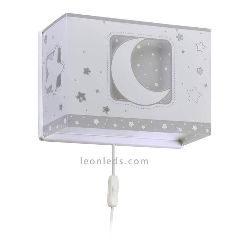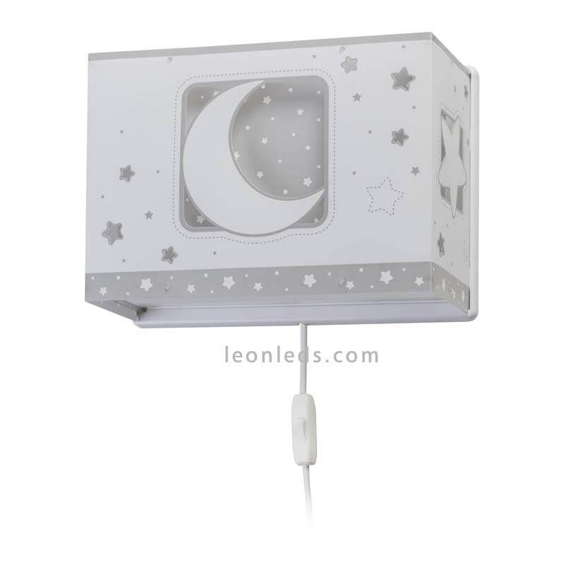 Kinder-Wandleuchte mit grauem Moon Light mit Schalter hat eine Höhe von 22,5Cm und eine Länge von 31Cm, benötigt eine LED-Birne mit E27-Gewinde.