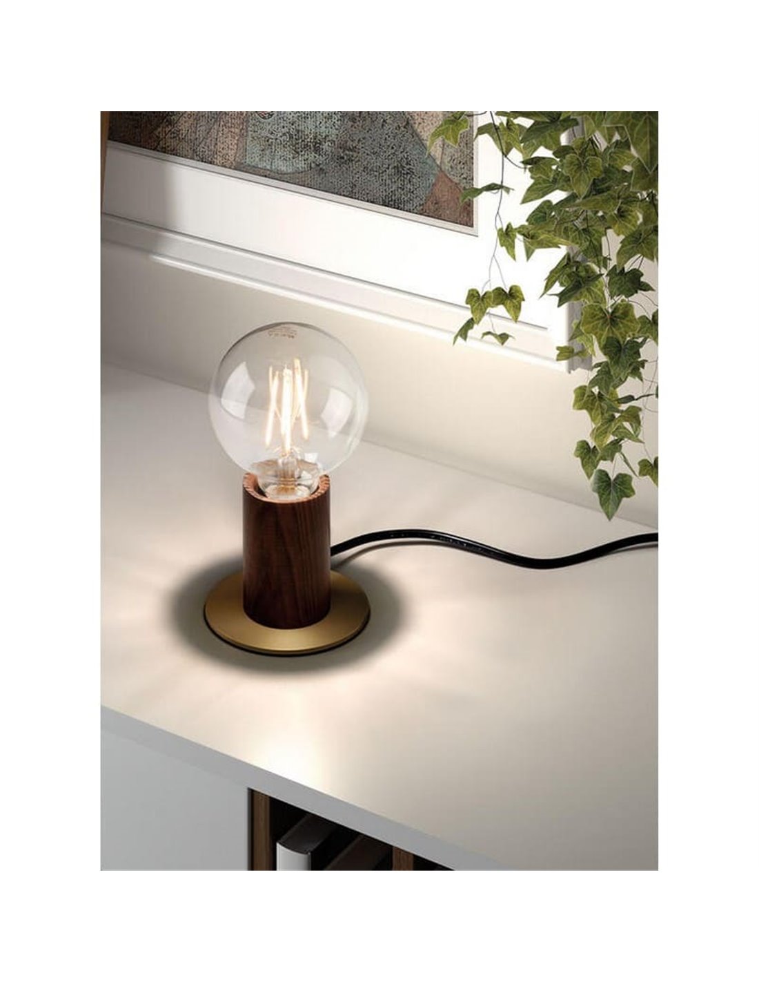 Sie müssen nur eine LED E27 Glühbirne des gewünschten Stils einschrauben, die Lampe an die Steckdose anschließen und einen sehr dekorativen ambienten Lichtpunkt genießen. Um den Effekt von mattem Messing und Walnussholz zu verstärken, wird empfohlen, Glühbirnen mit warmem Licht zu verwenden.
