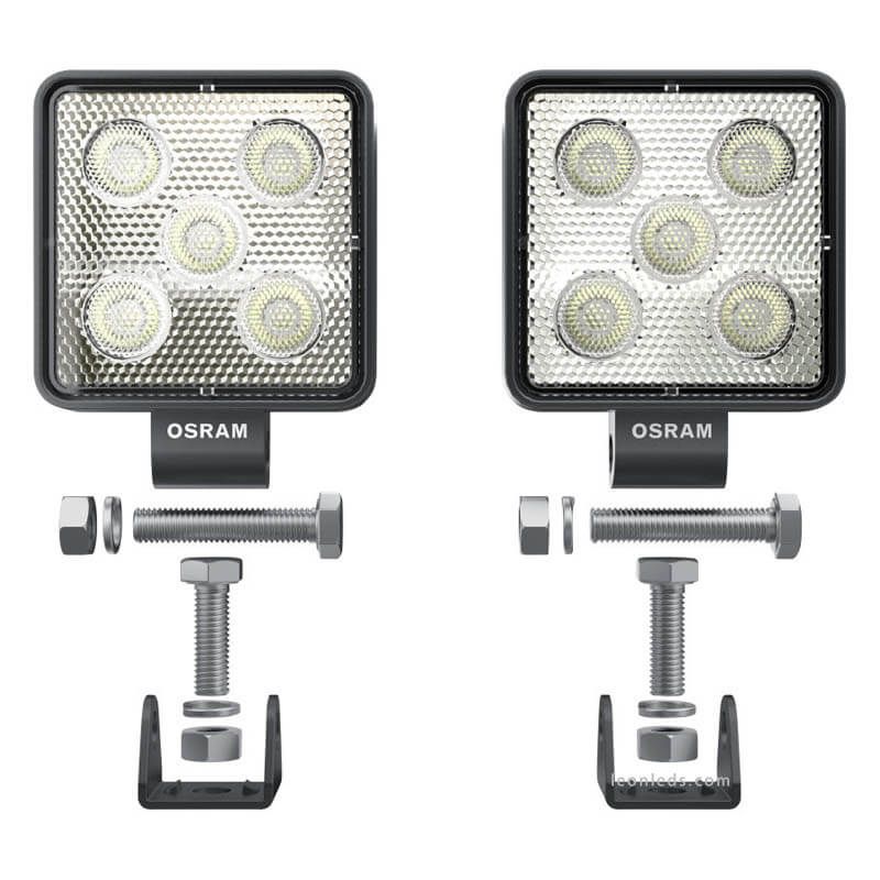 Enthält: 2 Osram Cube VX70-WD LED-Arbeitsscheinwerfer mit einem halben Meter Kabel, Halterungen und Edelstahl-Schrauben für die Installation.