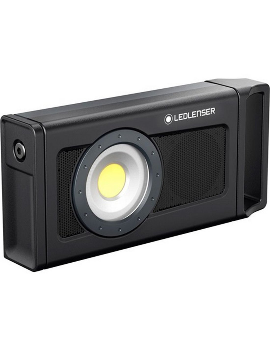 Wiederaufladbare LED-Arbeitslampe Ledlenser iF4R Music mit integriertem Bluetooth-Lautsprecher, entwickelt für professionelle Beleuchtung und Multimedia-Anwendungen. Sie bietet eine maximale Leistung von 2500 Lumen und fungiert auch als Powerbank.