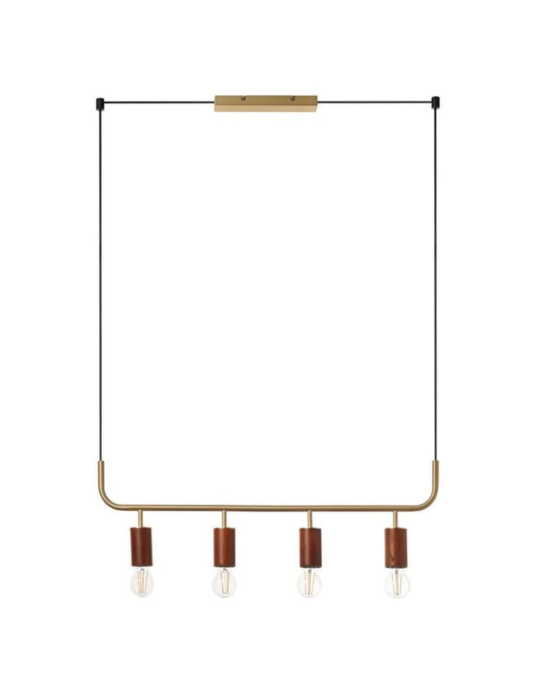 Die Pendelleuchte KOPA mit 4 Lichtpunkten E27 wurde entwickelt, um das Zentrum der Beleuchtung im Esszimmer oder in der Küche zu sein. Ihre Metallstruktur in mattem Messing bildet einen rechteckigen Rahmen, von dem eine Leiste mit vier zylindrischen Lampenfassungen aus Nussholz hängt, die dafür ausgelegt sind, dekortive LED-Glühbirnen vollständig sichtbar zu zeigen.