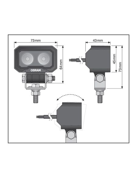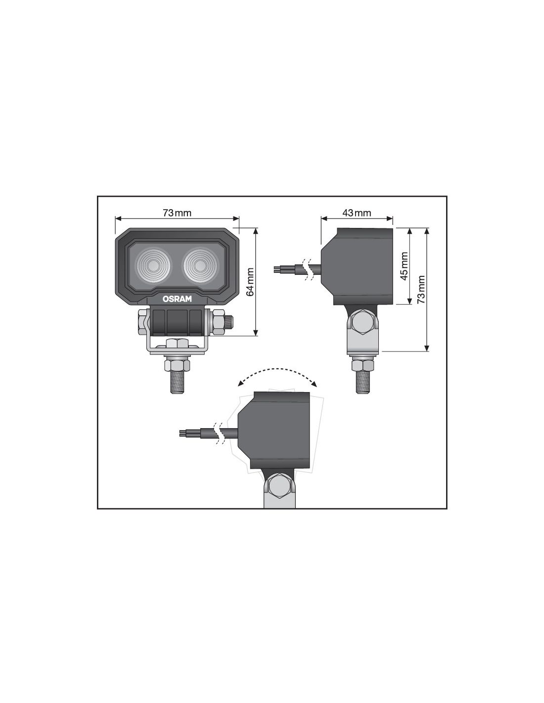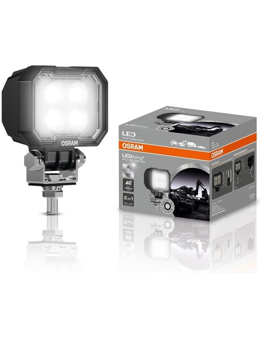 Arbeitsscheinwerfer LED OSRAM Rect WL VX80‑WD 1500 lm, 56 m. Anwendung: Arbeitslicht (nicht für Straßenanwendungen) vorne und hat auch die Genehmigung für den Rückwärtsgang. Effektiver Lichtstrom: 1500 lm. Reichweite bei 1 lx: 56 m. Farbtemperatur: 6000K.
