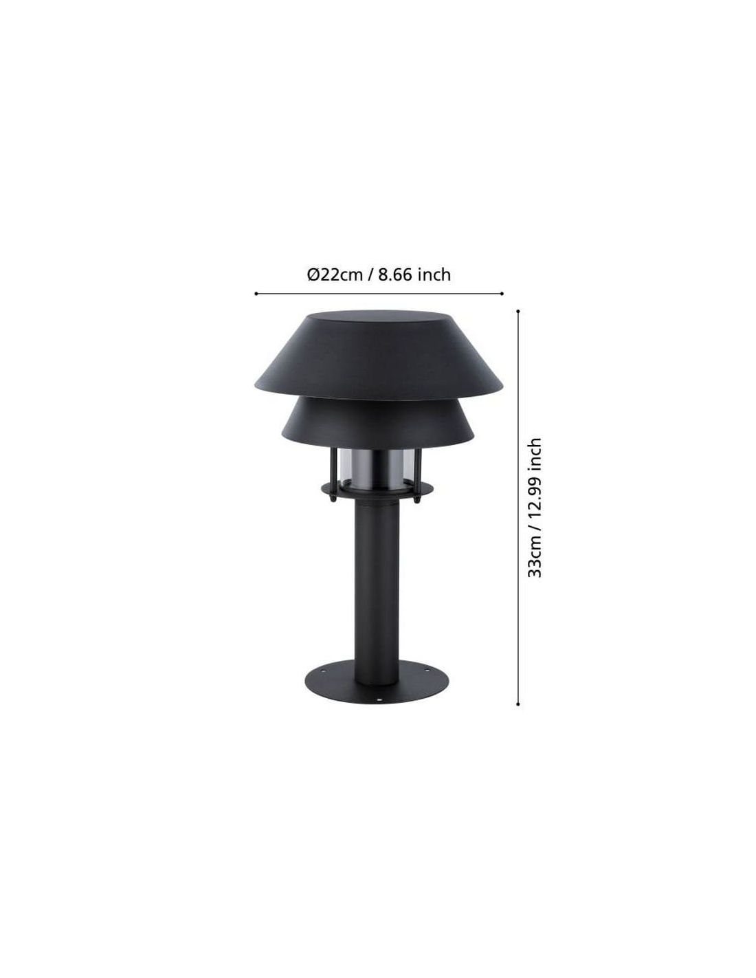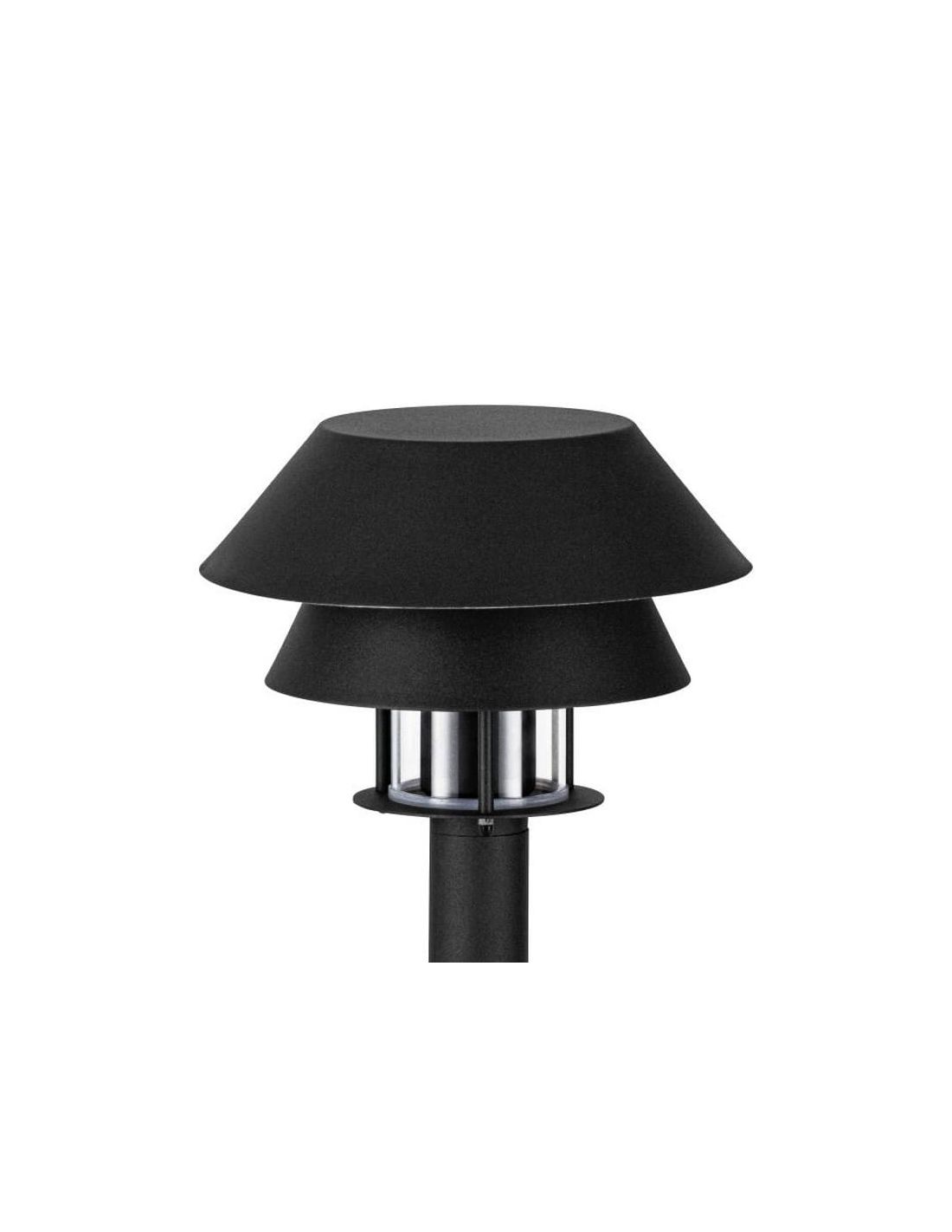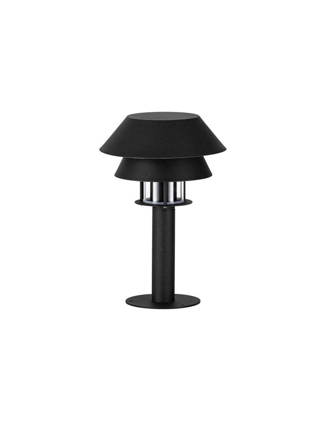 Die 33cm hohe Außenlaterne CHIAPPERA ist eine elegante und funktionale Option, um Ihre Außenbereiche zu beleuchten und zu verschönern. Hergestellt aus schwarzem Metall, bietet sie ein modernes Design mit zwei überlagerten konischen Schirmen in unterschiedlichen Größen, die sich perfekt in jede moderne Außenumgebung integriert. In der Mitte dieser Schirme beherbergt ein kleiner klarer Glaszylinder ein schwarzes Sockel für E27-Glühbirnen bis zu 40W (Glühbirne nicht enthalten).