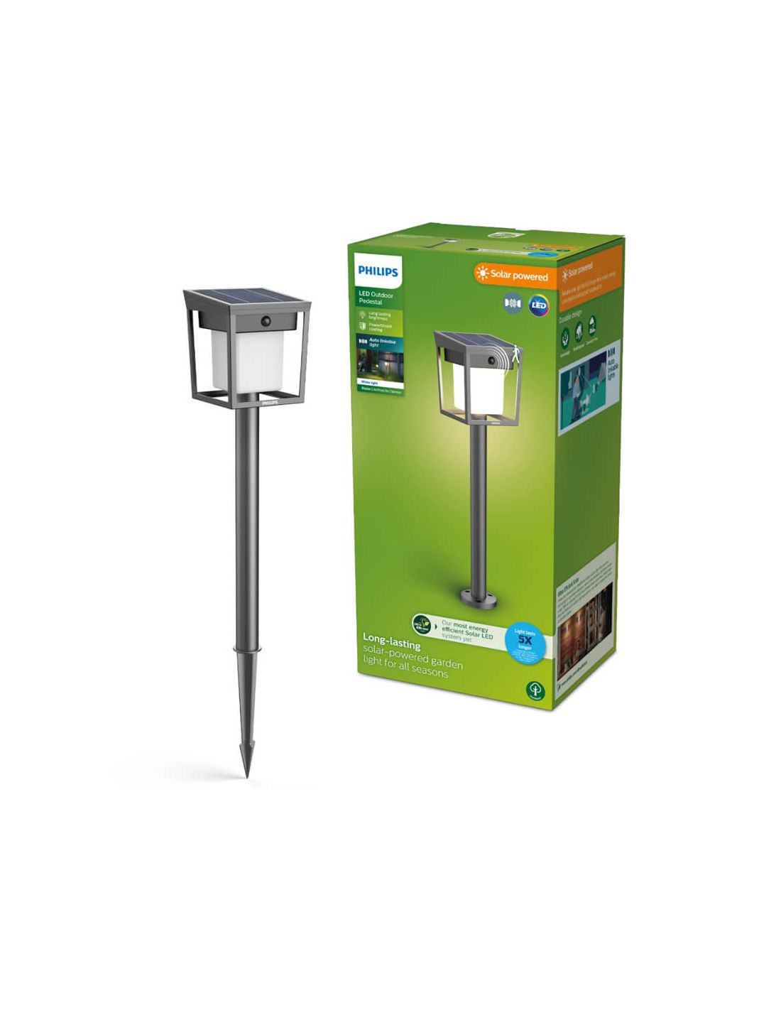 Die LED Solarleuchte BLAISE von Philips ist eine vielseitige und funktionale Leuchte, die entworfen wurde, um Wege, Pfade und Gartenbereiche mit Solarenergie zu beleuchten. Dank ihres integrierten Solarpanels, speichert sie tagsüber Energie, um nachts warmes und einladendes Licht bereitzustellen. Ihre Installation mit Erdspieß ermöglicht eine problemlose Platzierung auf jedem Erdboden ohne Bauarbeiten oder Kabel.