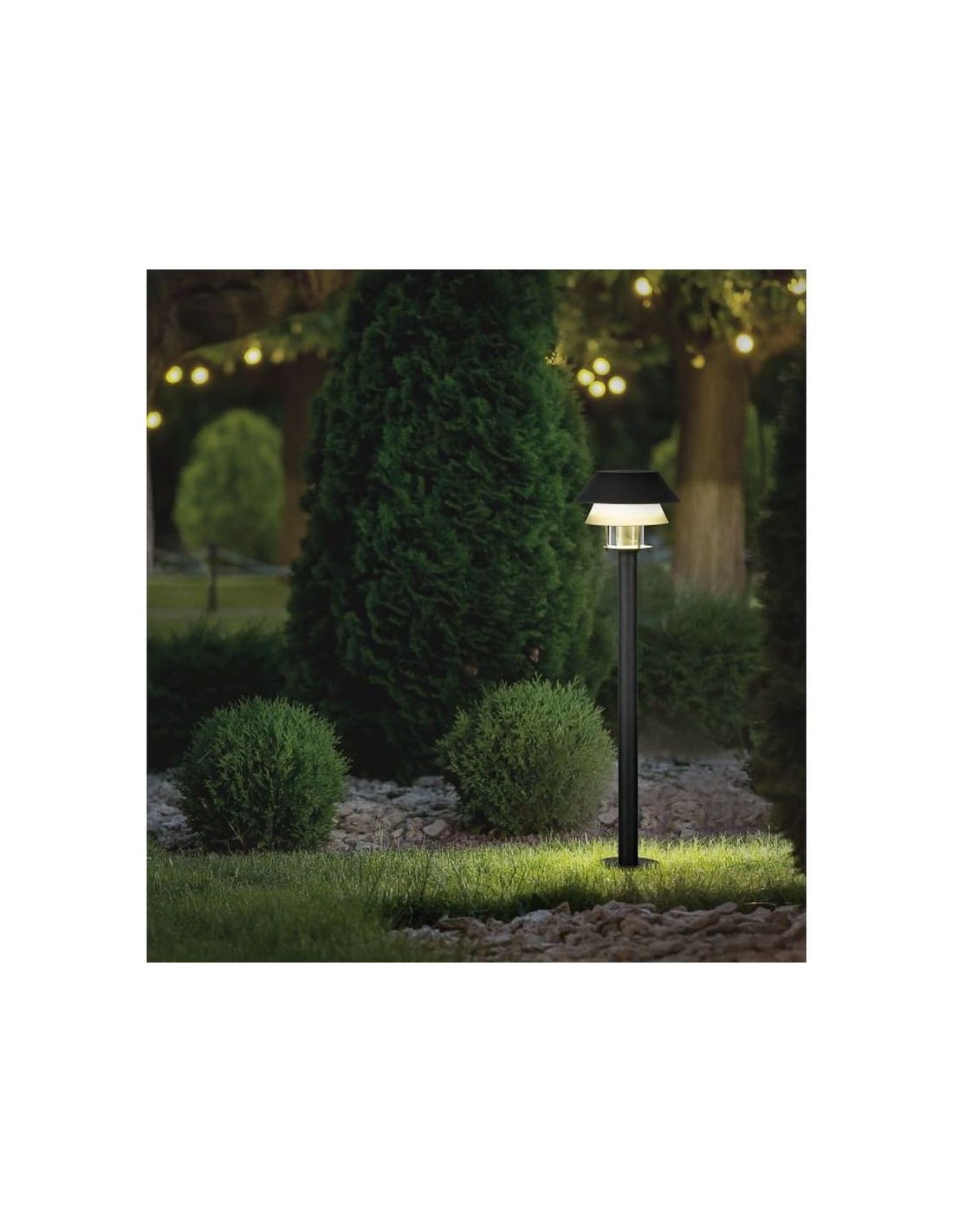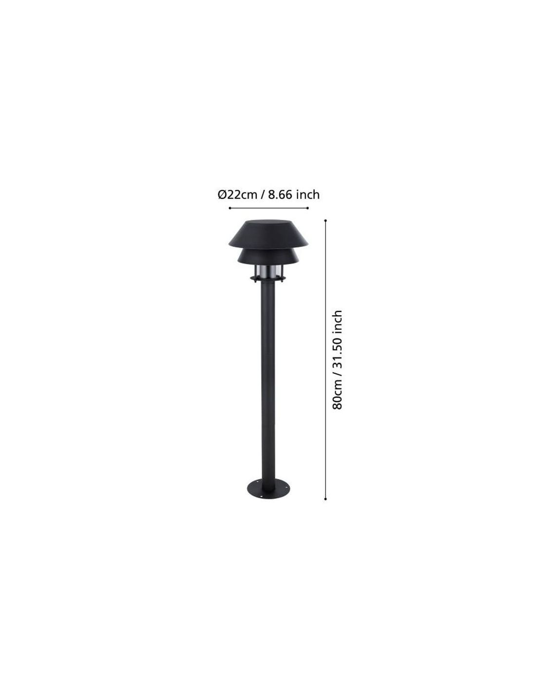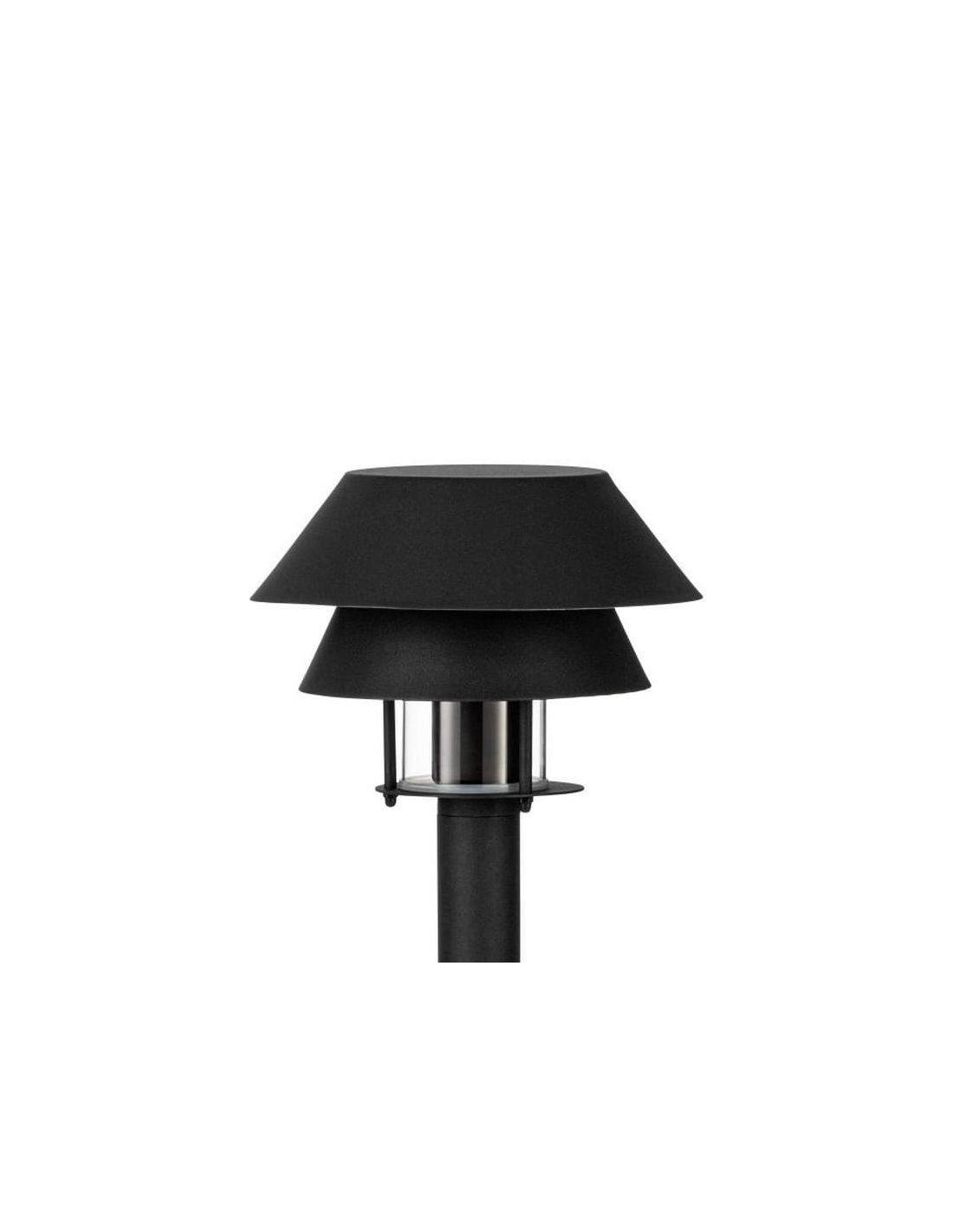 Der 80cm hohe Außenpoller CHIAPPERA ist eine hochwertige Leuchte, die Funktionalität und Stil kombiniert, um Ihre Außenbereiche zu beleuchten. Hergestellt aus schwarzem Metall, bietet er ein modernes Design mit zwei überlagerten konischen Schirmen in unterschiedlichen Größen, die eine elegante und zeitgenössische visuelle Wirkung erzeugen. In der Mitte dieser Schirme beherbergt ein kleiner klarer Glaszylinder ein schwarzes Sockel für E27-Glühbirnen bis zu 40W (Glühbirne nicht enthalten).