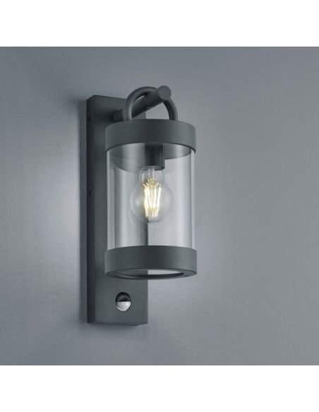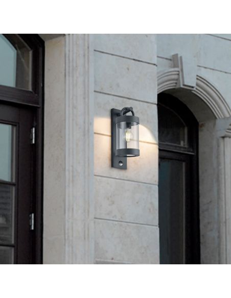 Außenwandleuchte mit Bewegungsmelder Sambesi von Trio Lighting. Es handelt sich um eine zylindrische Modernleuchte mit einem transparenten Glasschirm, in den eine 1 E27-Glühbirne (nicht enthalten) installiert werden muss. Ihr Gehäuse besteht aus Druckguss-Aluminium und Glas. Diese Außenleuchte ermöglicht es uns, jeden Bereich zu beleuchten, der Beleuchtung benötigt, indem sie Bewegungen erkennt, wie z.B. Durchgangsbereiche, Wege, Eingänge und Veranden. Sie verfügt über einen seitlichen Schalter, mit dem wir den Sensor ein- oder ausschalten können, falls wir dies manuell tun möchten.