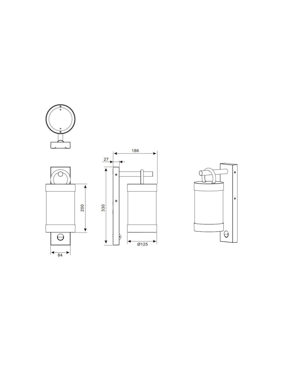 Die Abmessungen sind auf einem der Fotos zu sehen: Höhe 33Cm und Breite 13Cm. Es ist die perfekte Wandlampe, um moderne Außenfassaden zu beleuchten. Sie gibt gleichmäßiges Licht ab, dank ihres transparenten Schirms, in dem wir die Glühbirne unserer Wahl installieren können, obwohl wir empfehlen, eine Vintage-Glühbirne mit warmem Licht (3.000K) zu wählen, in der wir das Filament sehen können.