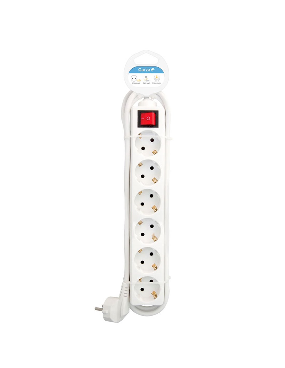 Die Steckdosenleiste Garza mit 6 Schuko-Steckdosen und einem 3 Meter langen Kabel mit 1,5 mm² Querschnitt ist eine robuste und zuverlässige Lösung zur Verbindung mehrerer elektrischer Geräte. Sie verfügt über einen beleuchteten Hauptschalter, Kindersicherung und Überspannungsschutz, geeignet für den Einsatz in Wohn- oder Büroumgebungen.
