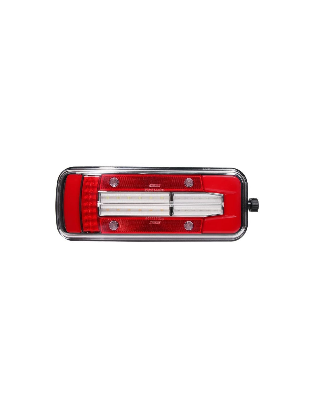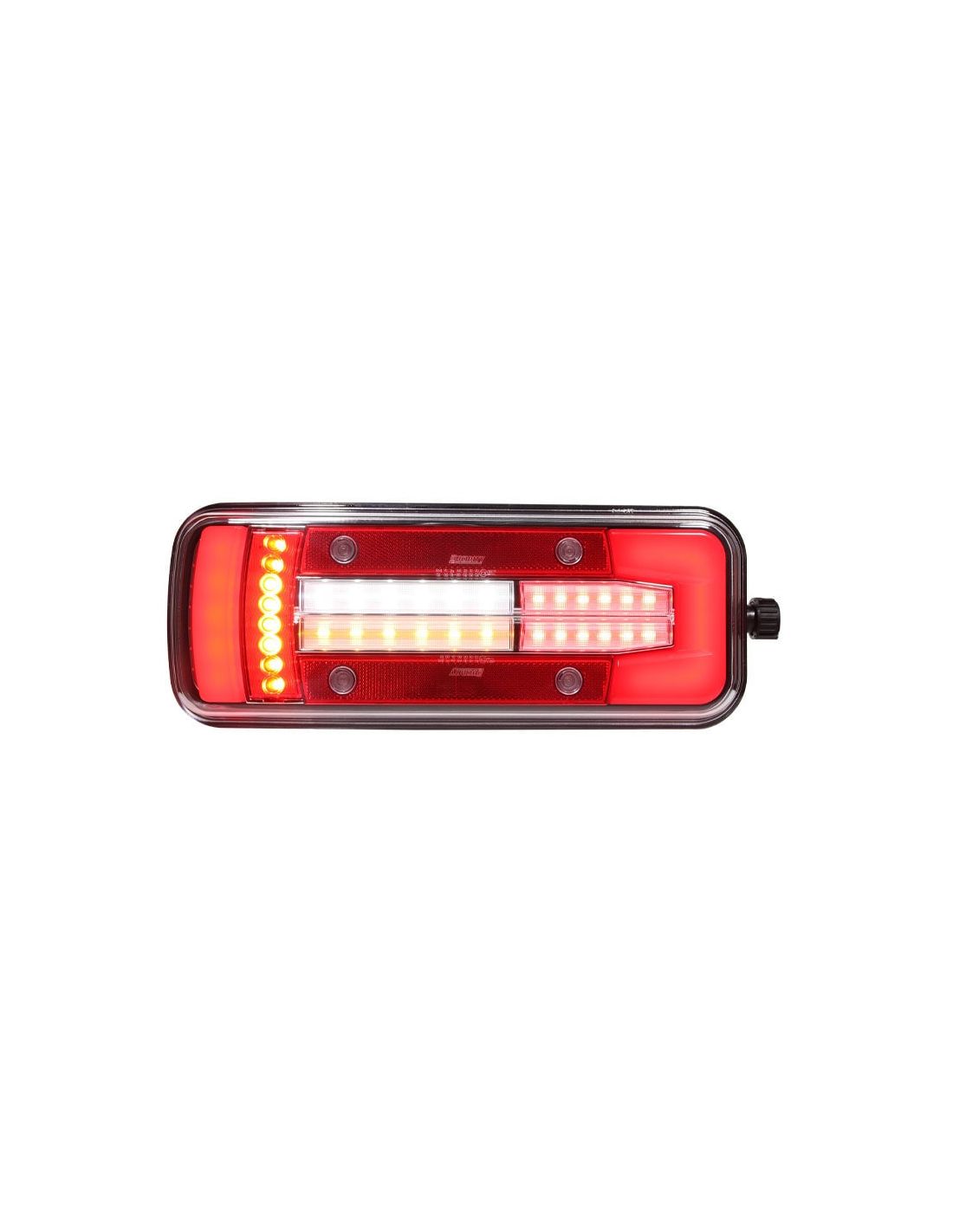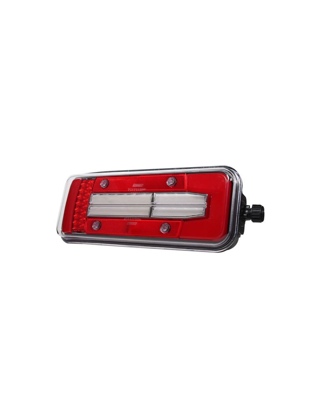 Rückleuchte LED 8 Funktionen für Lkw mit seitlichem 7-Pin Tyco-Stecker zur Installation in einer Zugmaschine, geeignet für 12V und 24V, linke Seite mit unterer Kennzeichenbeleuchtung.