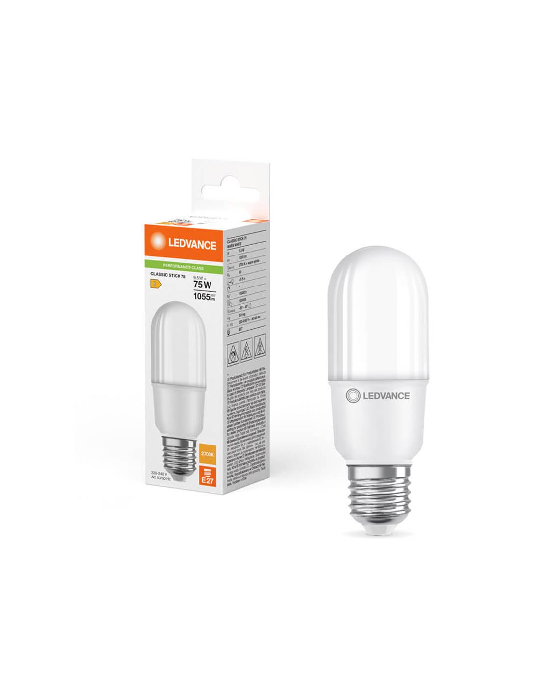 LED-Birne Modell Stick mit weiß-matter Oberfläche von 9W Ersatz 75W von der Marke LedVance mit E27-Gewinde, mit einer Lichtintensität von 1.055Lm. Diese Birne ist aus der Performance Class Classic Stick-Serie von LedVance mit einer Lebensdauer von 15.000 Stunden und 4 Jahren Garantie.