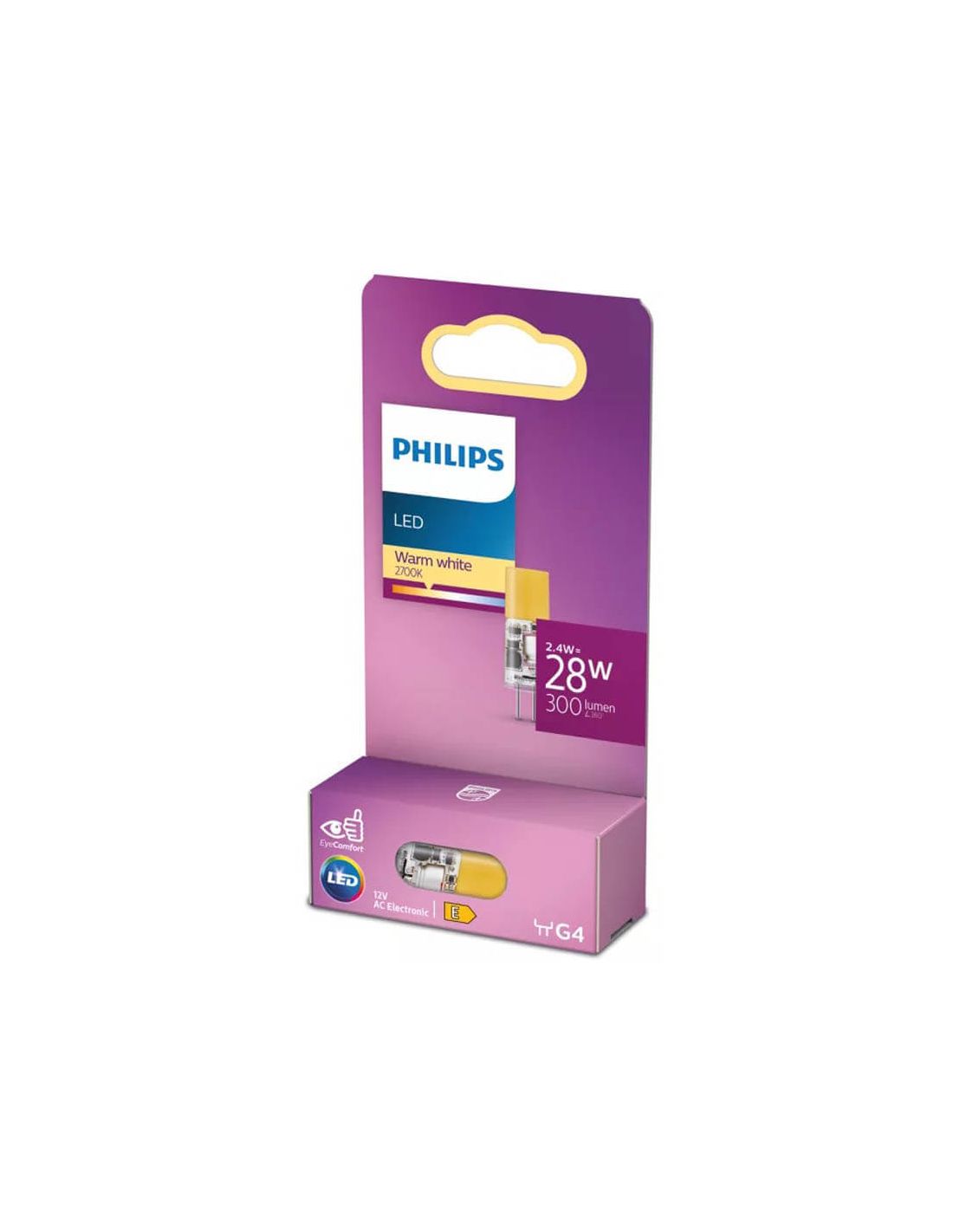 LED G4 Lampe Philips 2,4W entspricht 28W Halogen. Warmes Licht 2700K, 300 Lumen, 12V elektronisch. Nicht dimmbar. Lebensdauer 15.000 Stunden und EyeComfort-Technologie.
