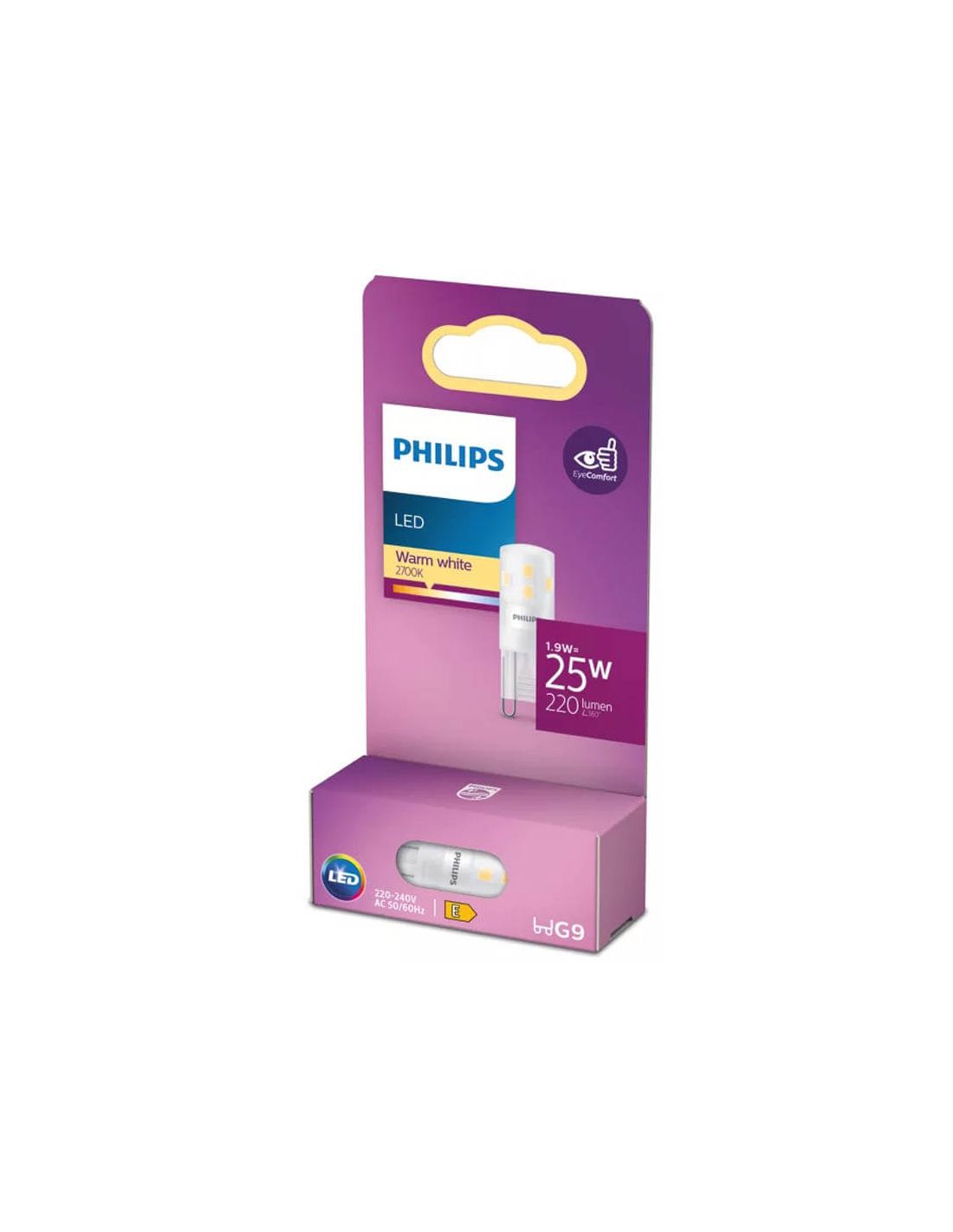 LED G9 1,9W entspricht 25W Halogen. Warmes Licht 2700K, 200 Lumen, Abstrahlwinkel 320°, nicht dimmbar. Betrieb AC 220-240V. Energieklasse E.