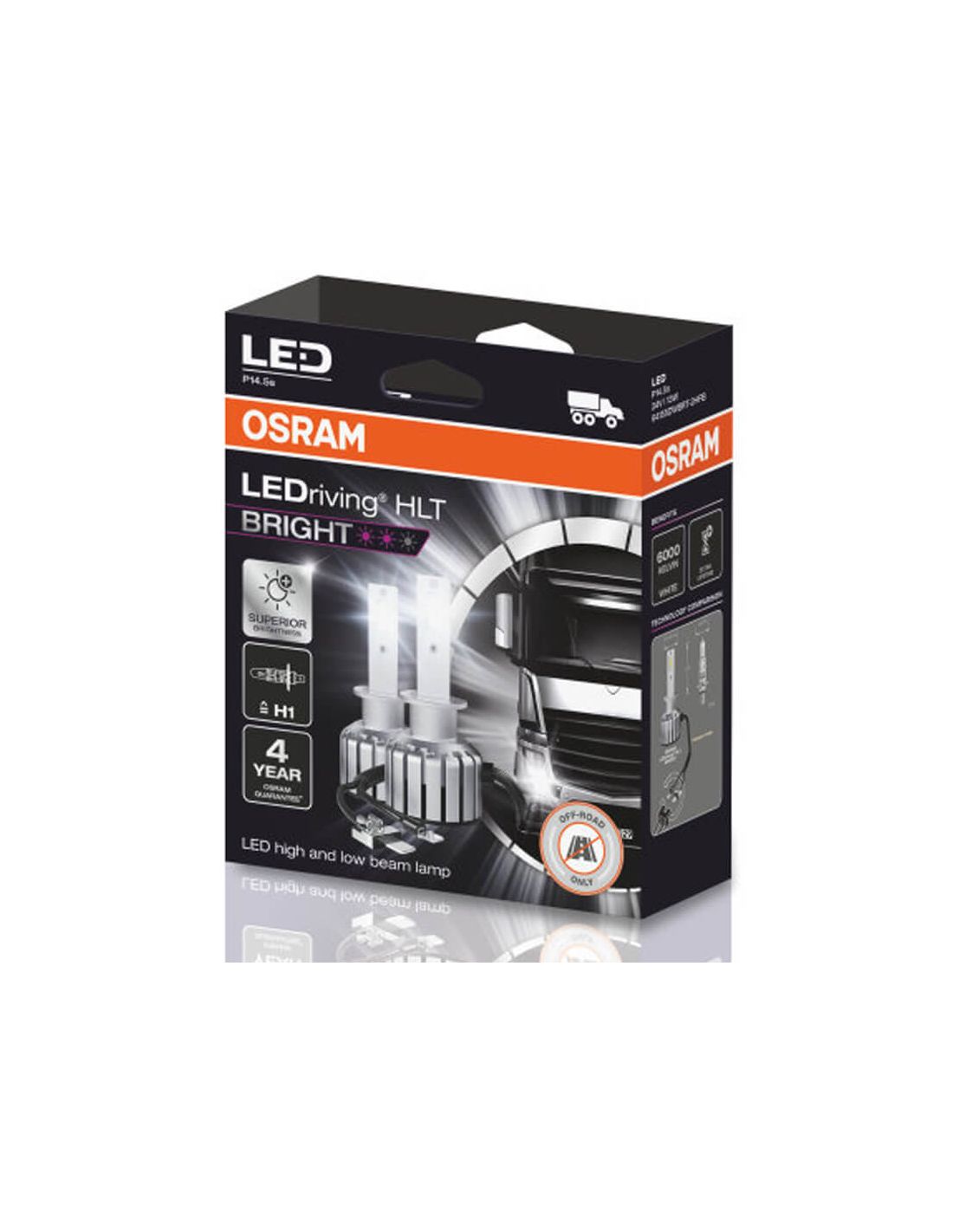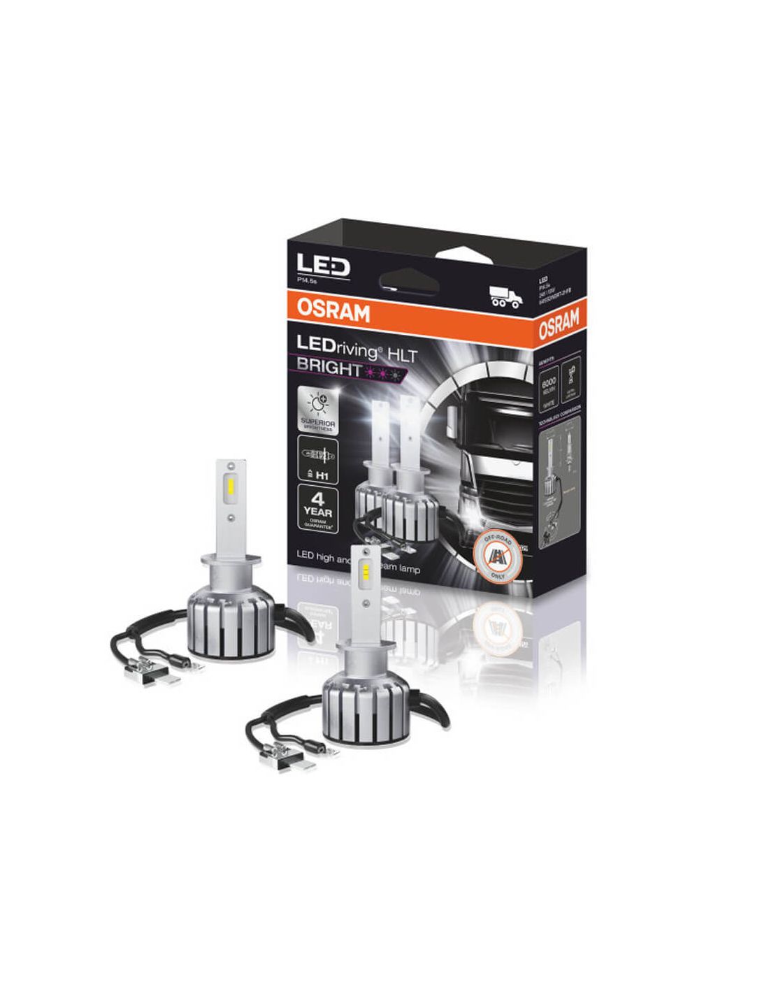 LED-Birnen H1 für Lkw von der Marke Osram mit der Referenz 64155DWBRT und einer Farbton von 6000K Kaltes Weiß mit einer Lichtstärke von 1.500Lm und einer Leistung von 13W, sie ist 300% heller als herkömmliche Halogenbirnen, neue HLT Bright Reihe.