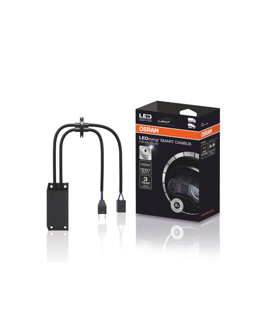 CanBus und Fehlerauslöser für LKW der Marke Osram Smart Canbus Error Canceller mit der Referenz LEDSCT10 für LED-Lampen H7 24V von Osram. Gültig für LED-Lampen für Fernscheinwerfer, Abblendlicht und Nebelscheinwerfer, inklusive Stecker für H7-Lampen.