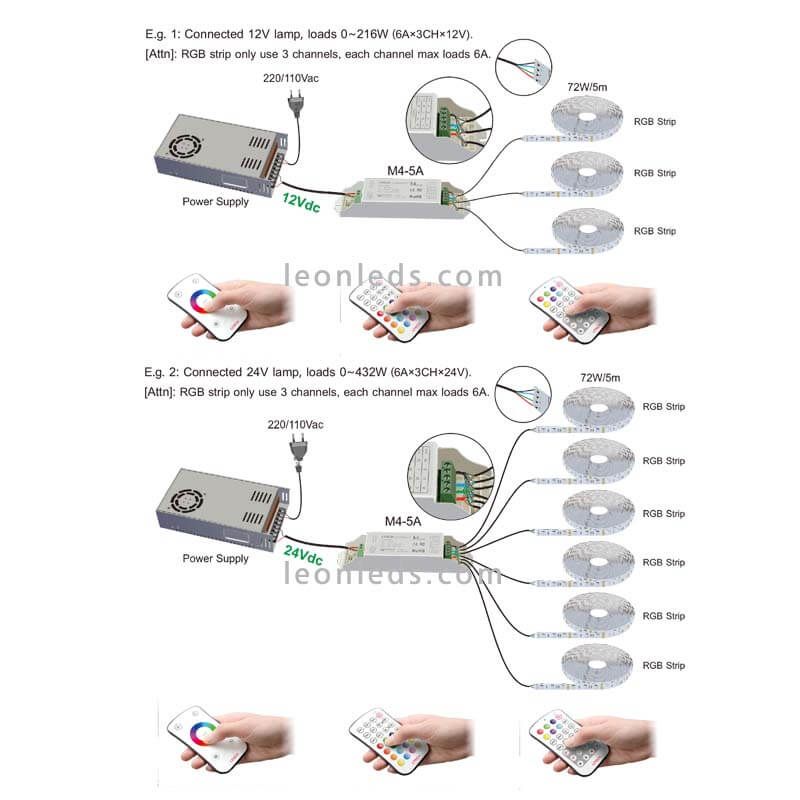 RGB LED Streifen Controller der Marke Ltech Modell M3 + M3 3A, geeignet für 12V und 24V DC, 3 Kanäle mit je 6A und maximal 18A. Die Gesamtleistung beträgt von 0 bis 120W pro 3 Kanäle, ermöglicht die Installation bis zu 432W Leistung bei 24V, 6 RGB LED Streifen mit je 72W pro LED Streifen, und bei 12V bis zu 216W, 3 LED Streifen mit je 72W pro Rolle, die Fernbedienung hat eine Reichweite von bis zu 30 Metern. Geeignet für 5V bis 24V DC.