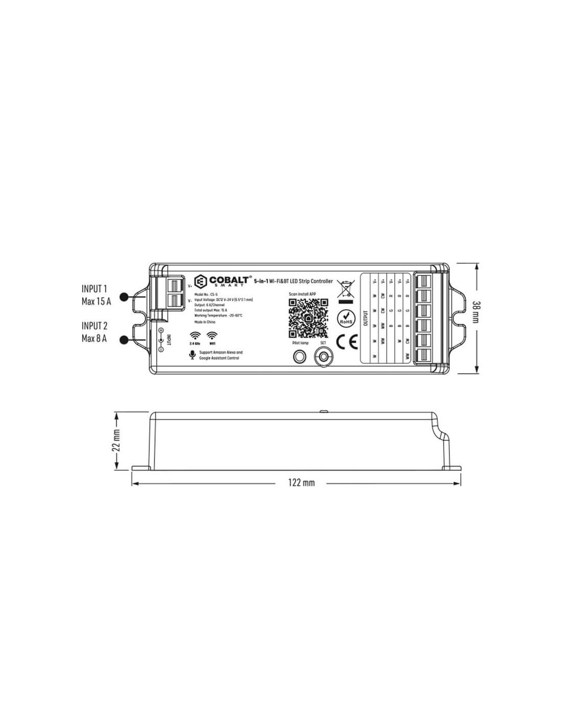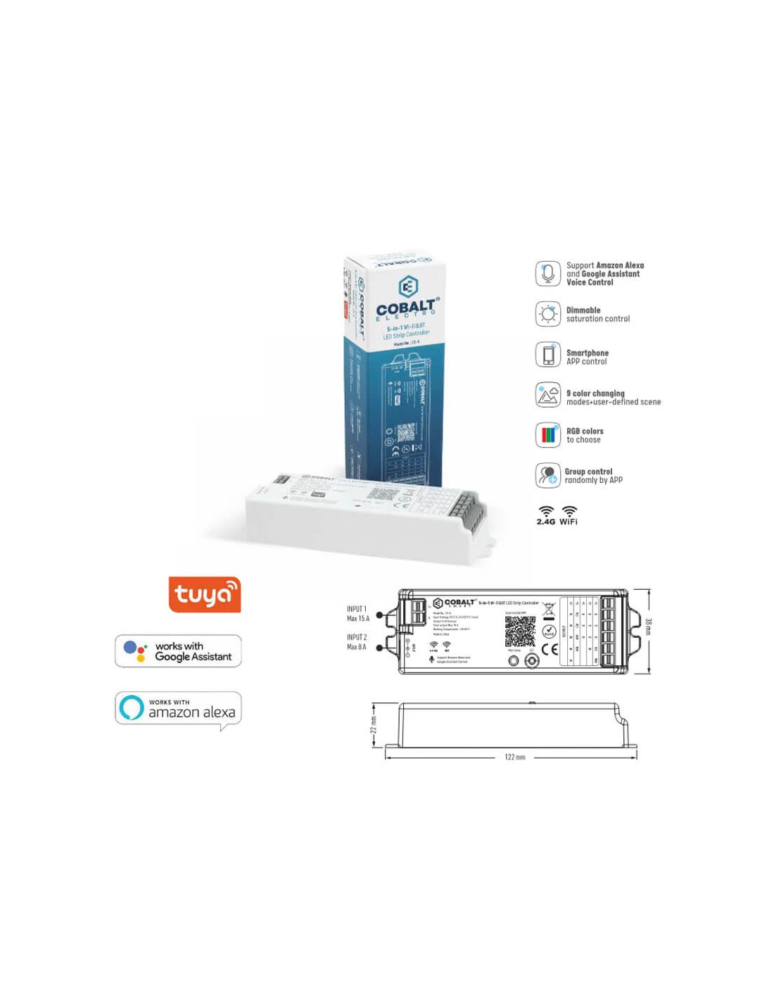 LED-Controller Cobalt Electro CS-5 mit WiFi- und 2.4GHz RF-Verbindung, kompatibel mit Tuya Smart Life und Fernbedienung. Steuere RGB-, RGBW-, CCT- und monochrome LED-Streifen mit bis zu 15A Gesamtleistung. 5 in 1.