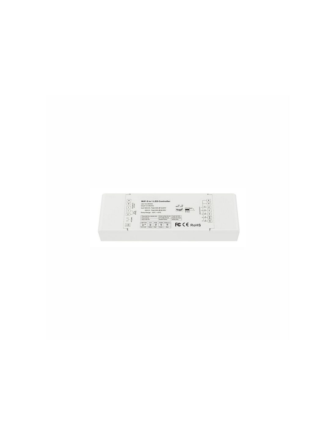 Tuya WiFi + RF 2,4 GHz 5-Kanal Controller für die Steuerung von LED-Streifen von 12V bis 48V. Kompatibel mit einfarbigen, CCT, RGB, RGBW und RGB+CCT LED-Streifen. Ermöglicht die Steuerung über Tuya App, Fernbedienungen und RF-Panels sowie Push-DIM-Taster. Ideal für intelligente und professionelle LED-Installationen. Abmessungen: 187 × 60 × 40 mm.
