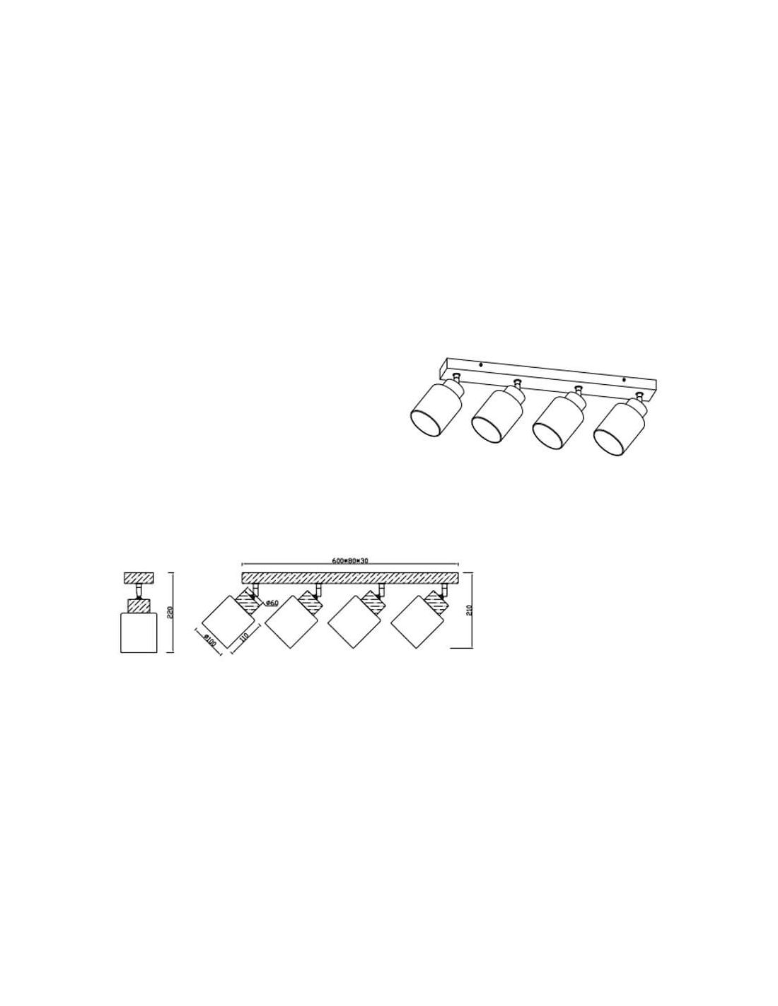 Der ASSAM-Strahler für Decke und Wand hat eine Leistung von 25W, für die er benötigt vier E14-Glühbirnen, die nicht im Paket enthalten sind. Maximale Sicherheit und Langlebigkeit mit seinem integrierten IP20-Schutz, der einen Widerstand gegen feste Körper mit einer Größe von mehr als 12 mm garantiert.
