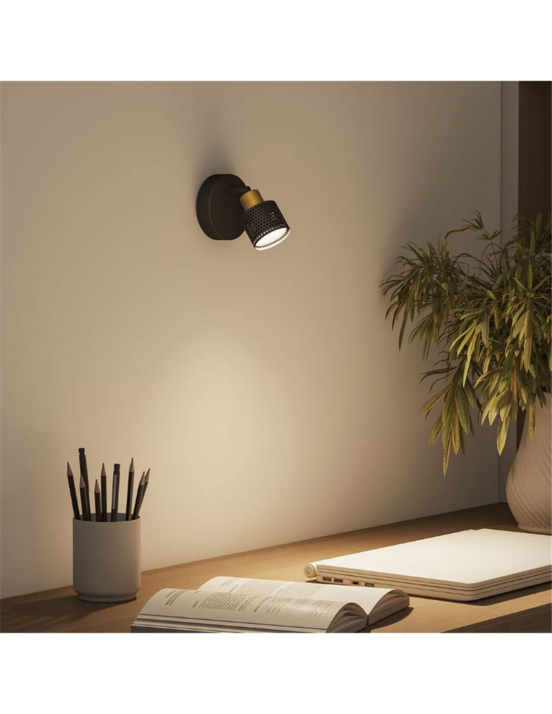 Decken-/Wandstrahler im industriellen perforierten Stil in Schwarz und Messing NIALL, GU10 (Nicht enthalten) - Ideal, um Ihren Räumen einen modernen und eleganten Touch zu verleihen. Sein perforierter Zylinder und die Ausführungen in Schwarz und Messing bieten einen einzigartigen Stil. Kompatibel mit GU10-Glühbirnen. Einfache Installation dank des ClickFix-Systems.