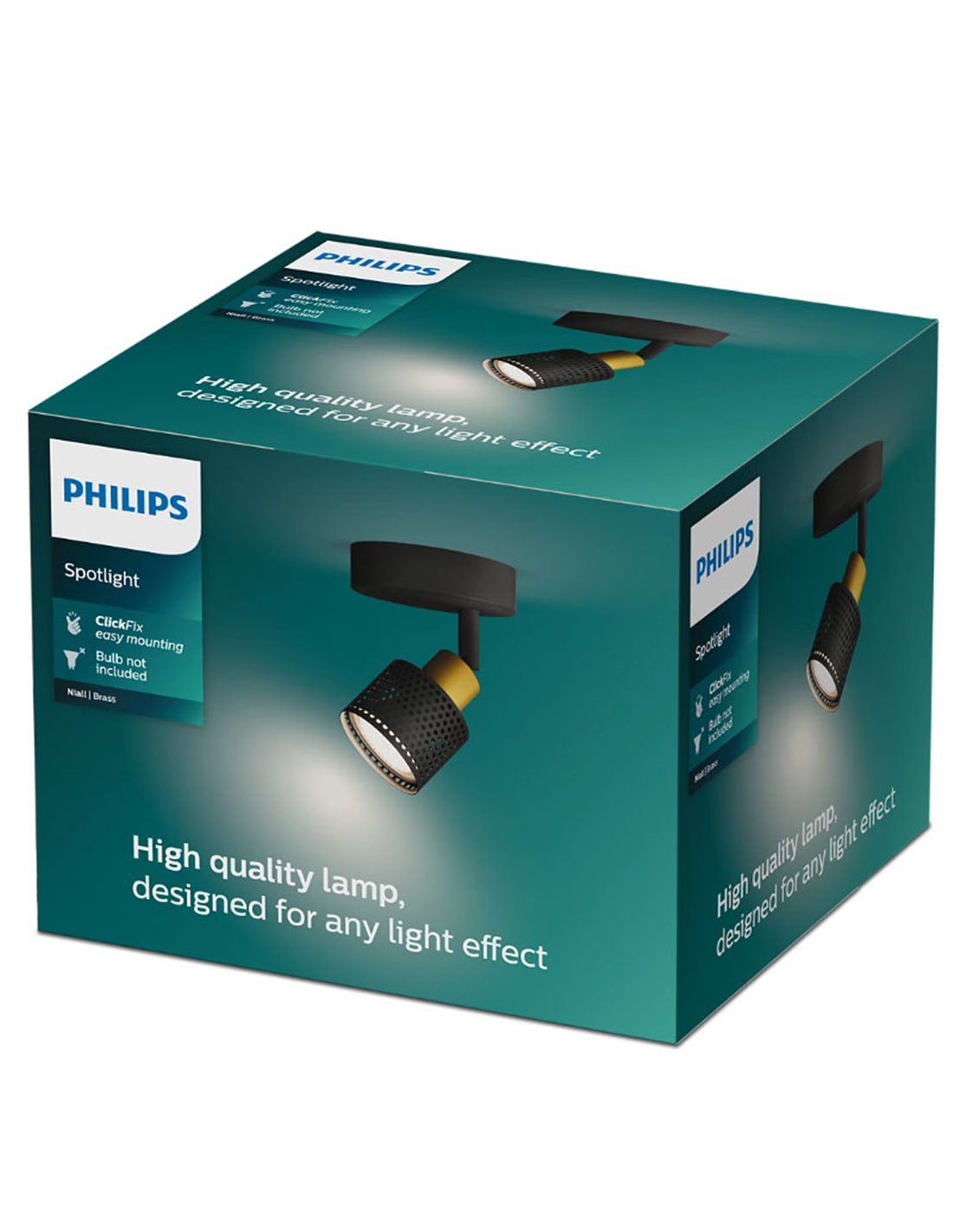 Der Decken-/Wandstrahler NIALL von Philips zeichnet sich durch sein elegantes und minimalistisches Design aus, das perfekt in industrielle und moderne Innenräume passt. Der perforierte Schirm in mattschwarz kombiniert mit Messingdetails verleiht ihm ein anspruchsvolles und auffälliges Aussehen, ideal für jeden Raum der Wohnung wie Wohnzimmer, Flur, Küche oder Schlafzimmer.