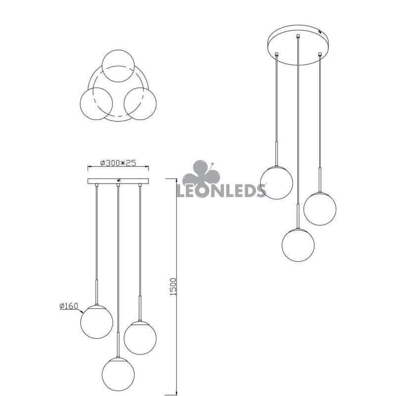 Die maximale Höhe dieser Deckenlampe mit 3 Kugeln beträgt 150 cm und kann individuell in der Höhe verringert werden, um das Design der Lampe anzupassen. Die Metallstruktur hat einen Durchmesser von 30 cm. Die Kugeln haben einen Durchmesser von 16 cm.
