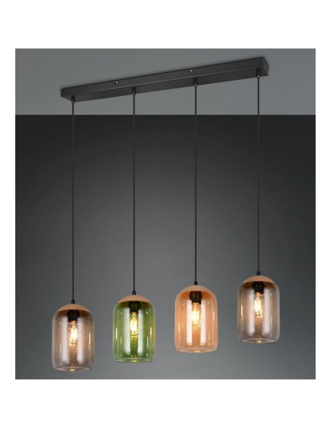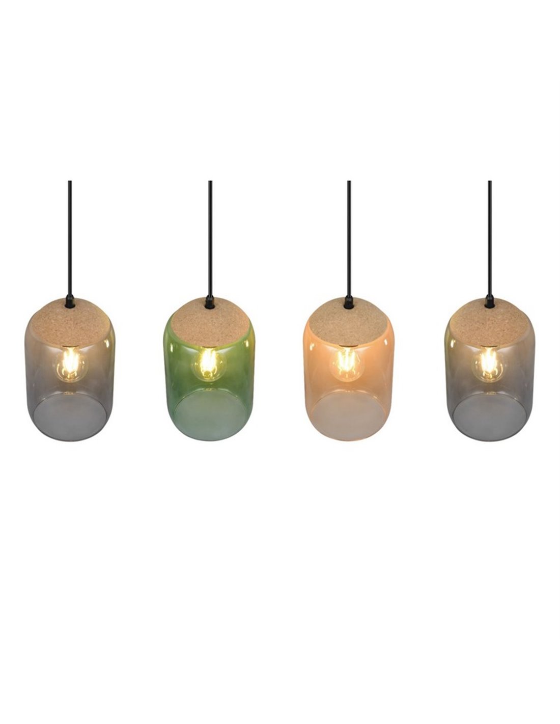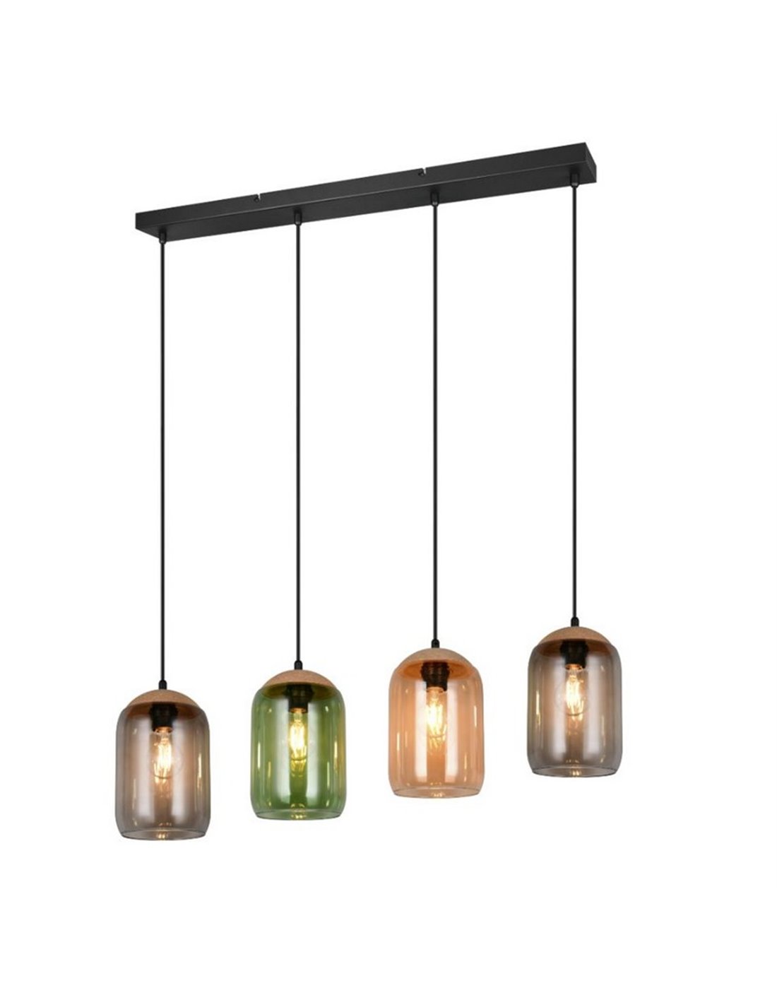 Die Deckenlampe CORK kombiniert natürliches und modernes Design in einem Stück, das sich durch seine Tulpen aus Glas in bernsteinfarbenen, grünen und rauchigen Tönen auszeichnet. Ihre schwarze Metallstruktur und Details aus recyceltem Kork verleihen jedem Raum einen warmen und nachhaltigen Stil. Perfekt für Wohnzimmer oder Esszimmer, die eine dekorative Beleuchtung mit Persönlichkeit suchen.