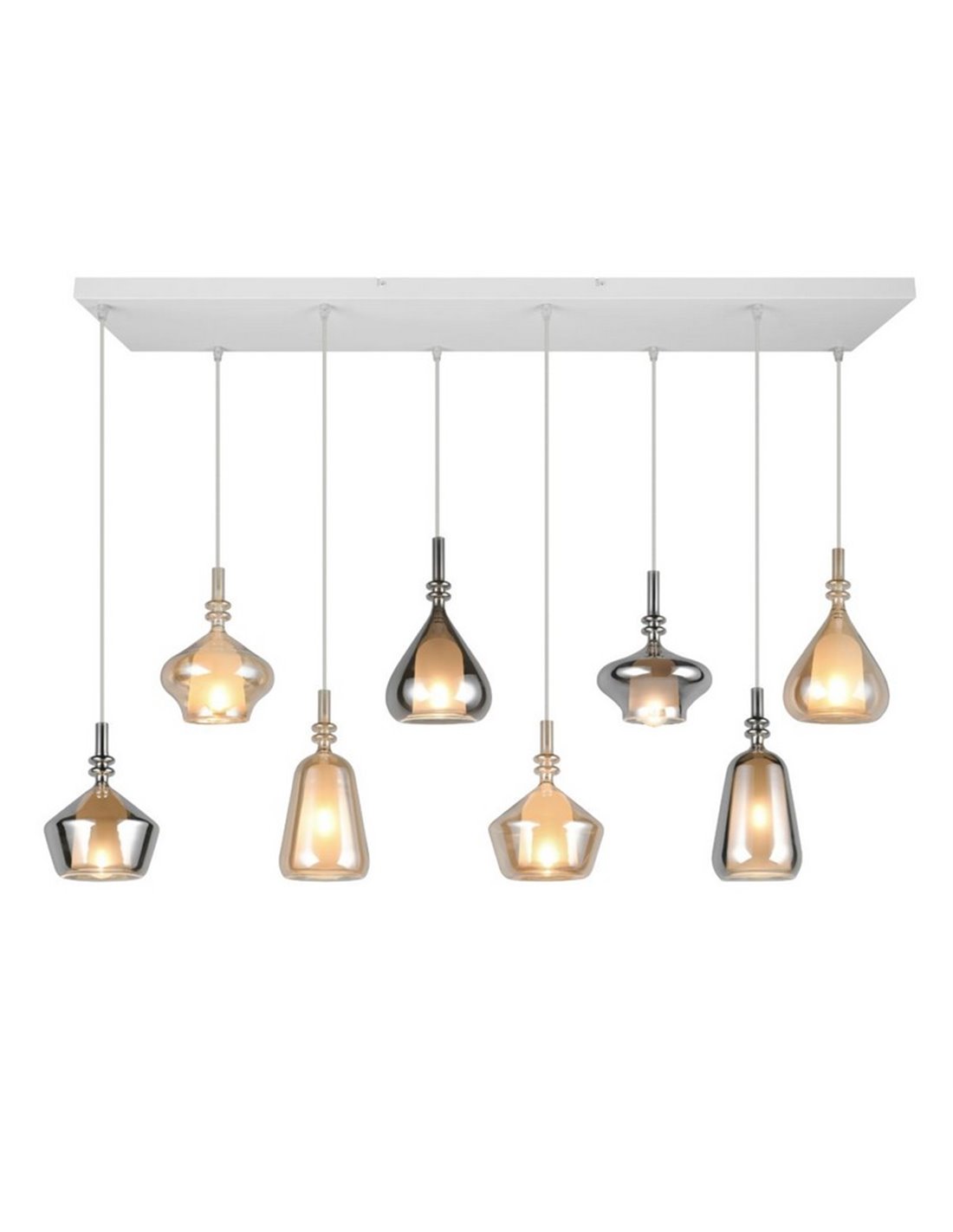 Die Deckenlampe ALDEA mit 8 Schirmen kombiniert rauchiges Glas in bernsteinfarbenen und verchromten Tönen mit einer weißen rechteckigen Basis. Die in unterschiedlichen Höhen hängenden Schirme erzeugen ein elegantes Volumen-Spiel, das ideal für Esszimmer oder großzügige Wohnzimmer ist. Sie funktioniert mit 8 E14 Glühbirnen (nicht enthalten) und hat IP20.