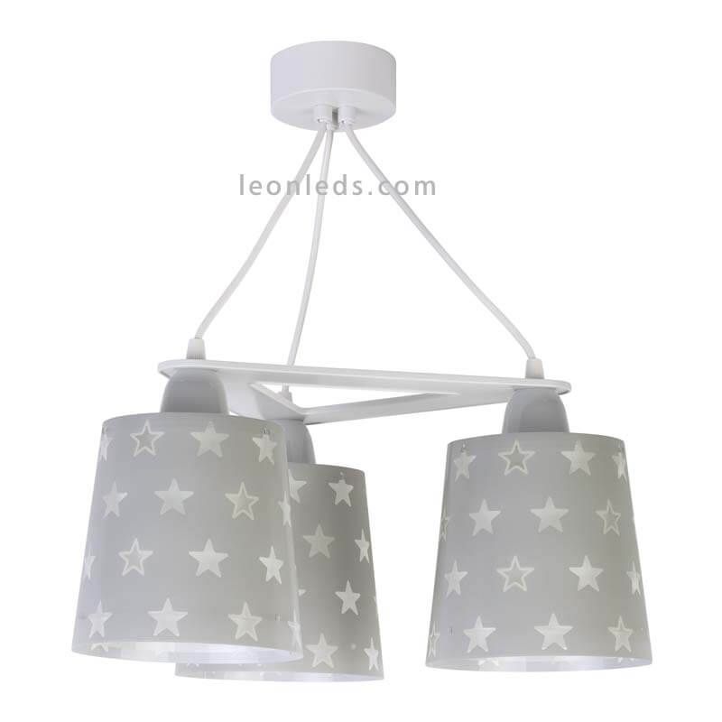 Deckenlampe im kindlichen Design mit 3 grauen Schirmen aus der Stars-Serie, die Schirme haben einen Durchmesser von 15 cm und eine Höhe von 20,5 cm, die übrigen Maße können Sie auf einem der Fotos sehen.