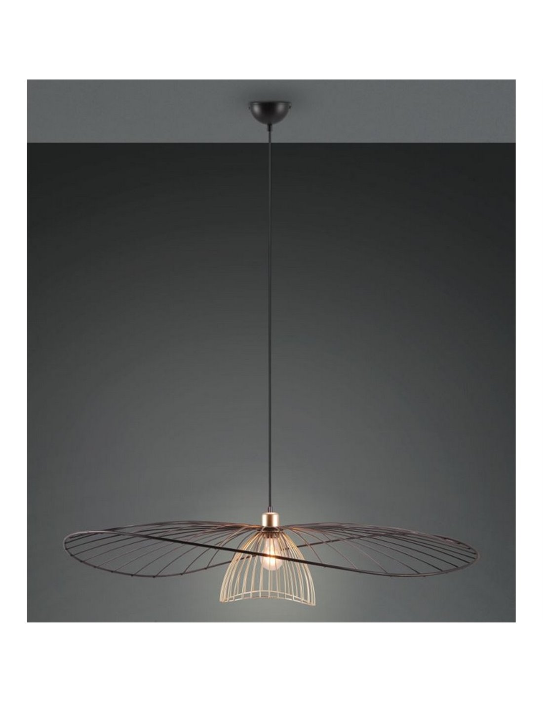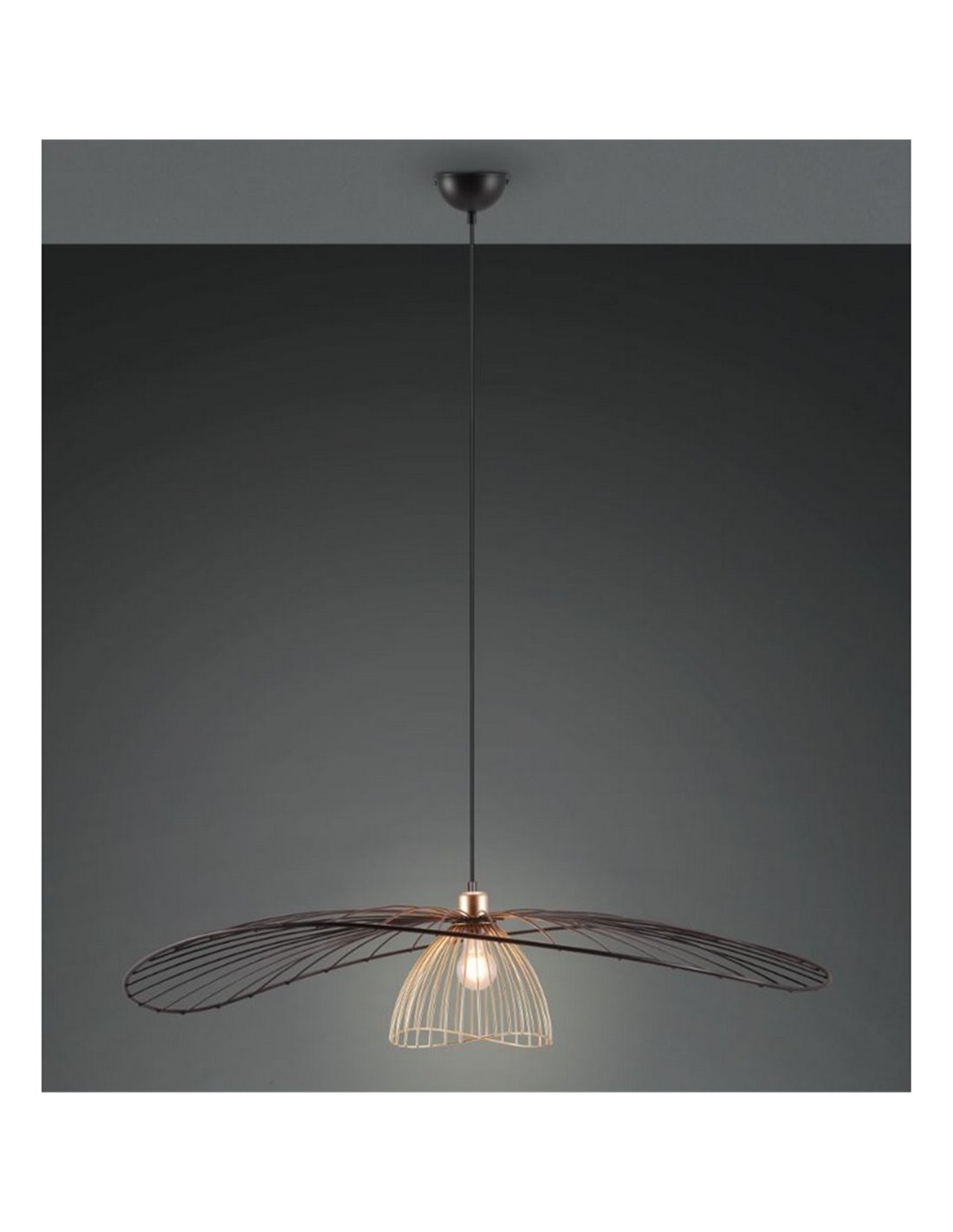 Die LAURIS ist eine Deckenlampe, die über einen schwarzen Metalldrahtschirm verfügt, ein offenes Design, das die Glühbirne hervorhebt und einen modernen und industriellen Stil beiträgt. Ihr Durchmesser von 100 cm macht sie zu einem perfekten dekorativen Stück für Wohnzimmer, Essbereiche oder große Räume.