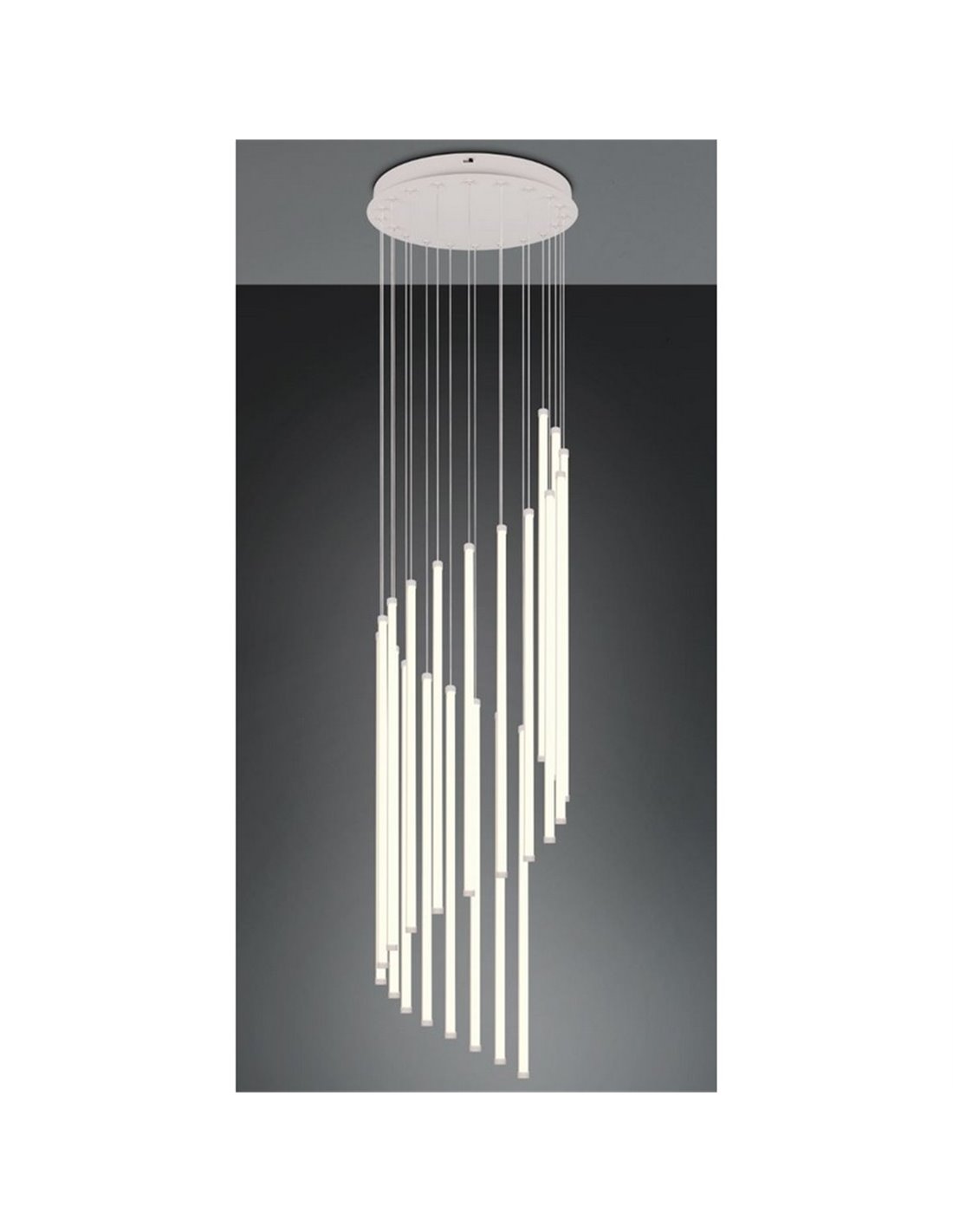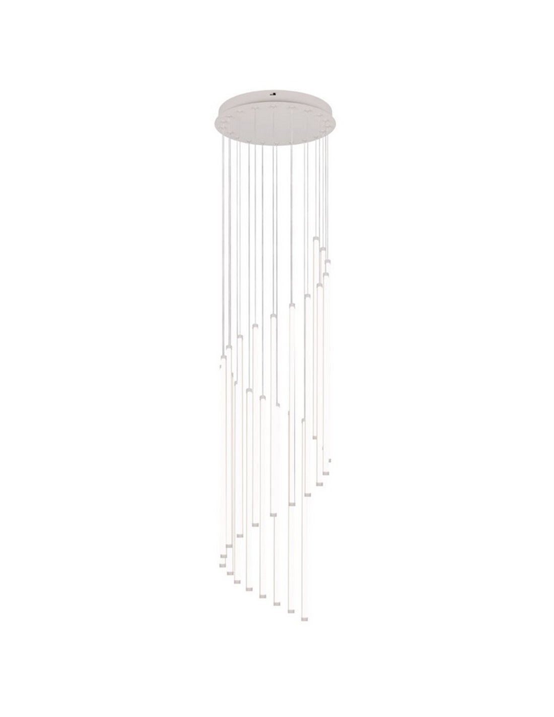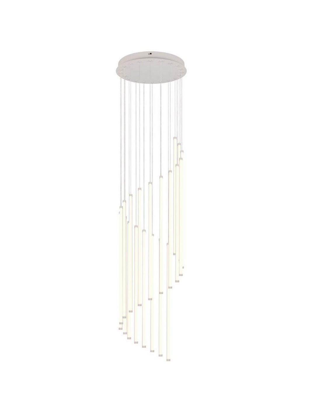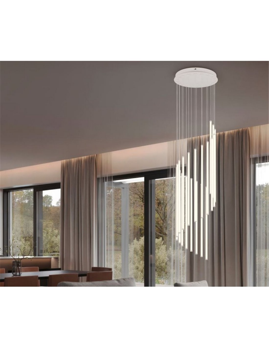 Deckenlampe LED BAXTER in weißer Ausführung mit hängenden Lichtern. Bietet 70 W und 8300 lm, mit 3 Lichttönen (2300 K, 3000 K und 4000 K). Ihre Abmessungen sind ↕ 220 cm | Ø 37 cm. Schutz IP20.