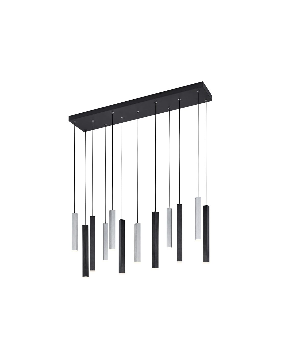 Hängelampe LED Civeto groß schwarz und silber 12L von Cinque Lighting. Sie ist mit einer rechteckigen Deckenhalterung aus schwarzem Metall ausgestattet, mit 12 hängenden Kabeln, die neun Lichtpunkte aus dekorativen, hängenden Rechtecken in silber und schwarz enthalten. Die Höhe jeder Hängeleuchte kann individuell reguliert werden.