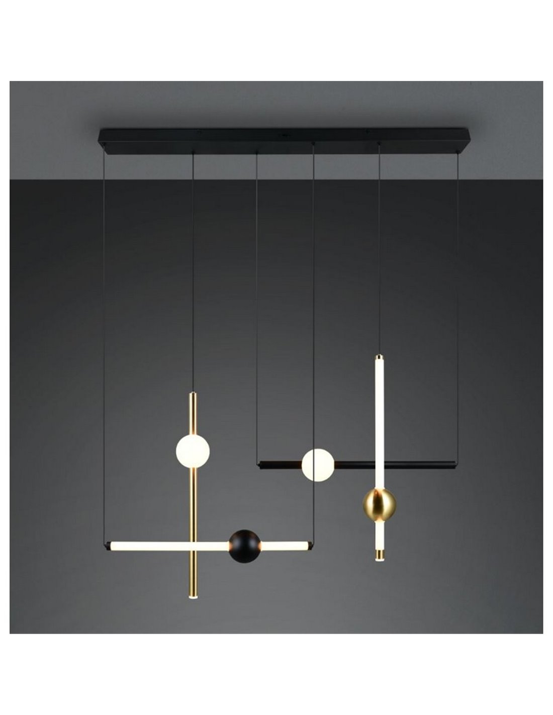 Die Deckenlampe LED MELITA mit mehreren Lichtern kombiniert eine elegante Ausführung in Schwarz und Gold mit einem länglichen Design, ideal für Esszimmer, Wohnzimmer oder große Räume. Ihr zeitgenössischer Stil macht sie zu einem dekorativen Highlight.