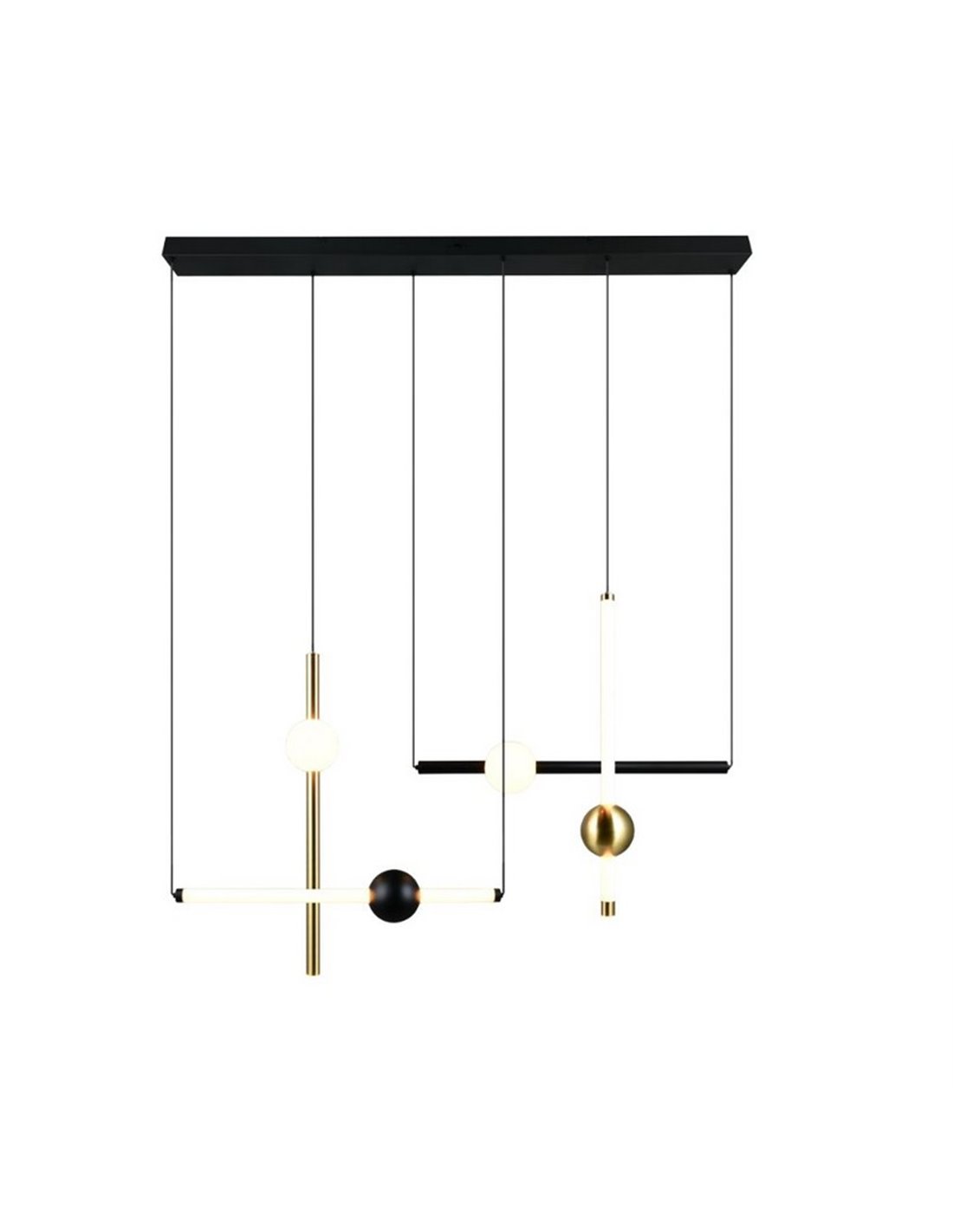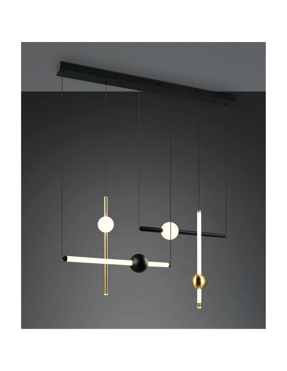 Deckenlampe LED MELITA in Schwarz und Gold mit mehreren Lichtern. Bietet 21 W und 2500 lm, mit wählbarer Lichtfarbe (2300 K, 3000 K oder 4000 K). Abmessungen: ↕ 150 cm | ⟷ 110 cm | Tiefe 10 cm. Schutz IP20.