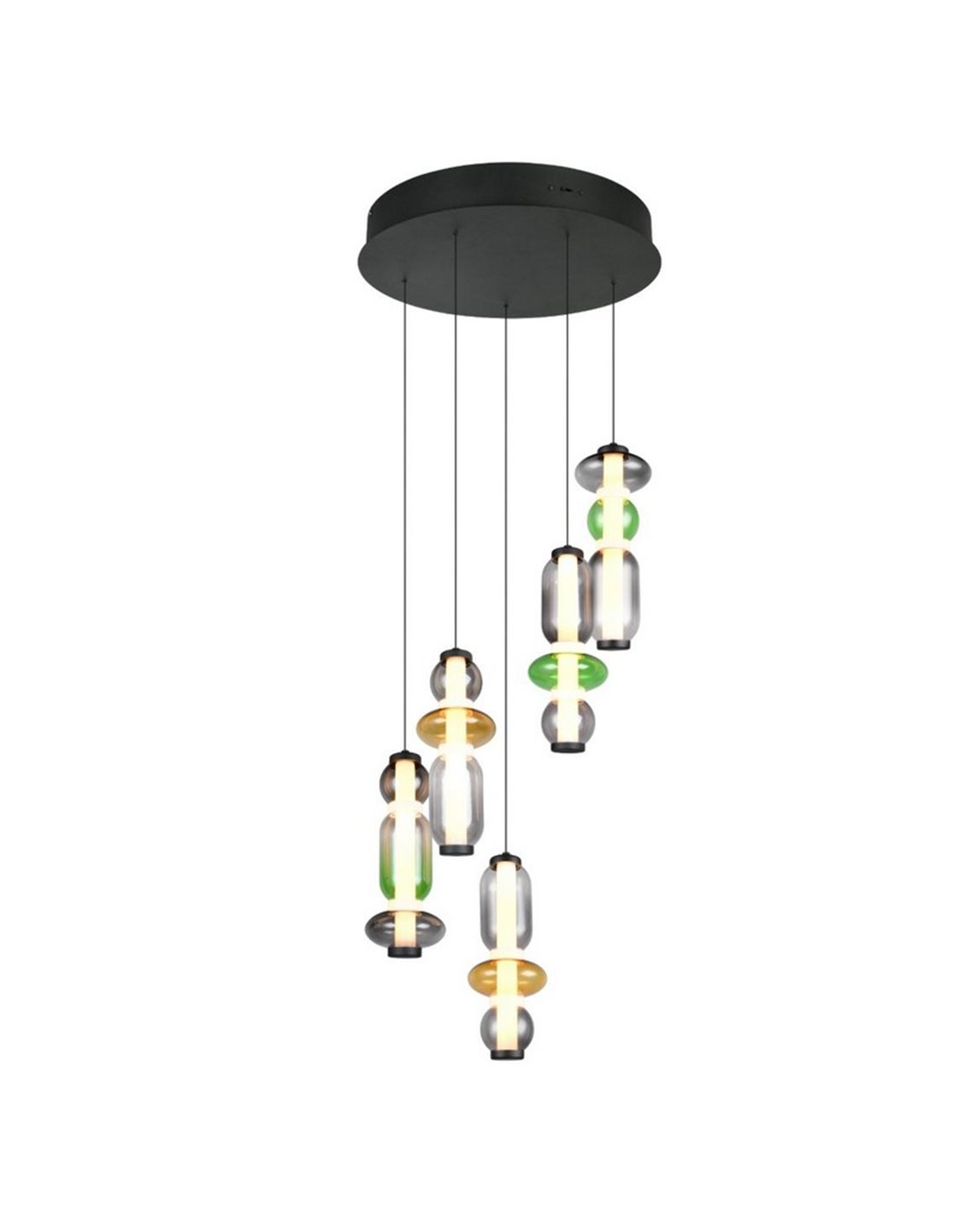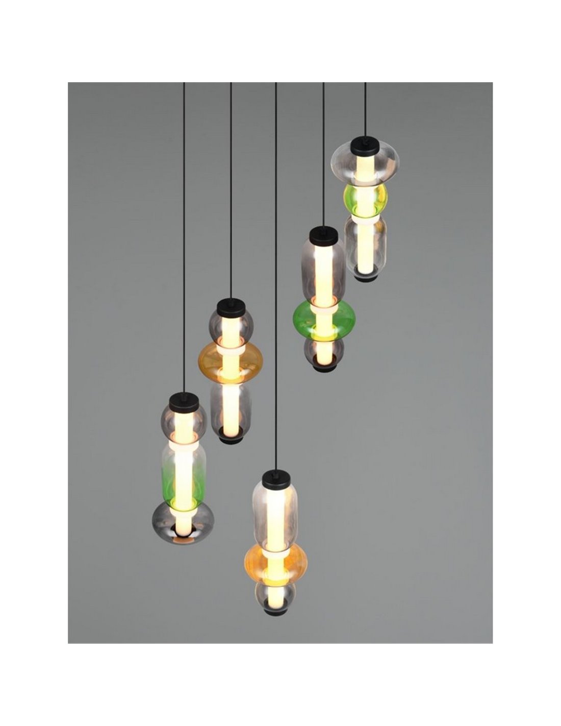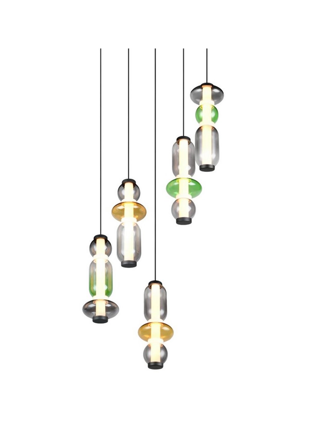 Die bunte MINERVA mit 5 Leuchten bringt Dynamik und Charakter in jeden Raum dank ihrer vertikalen Bauweise und den dekorativen Glasglocken in verschiedenen Farben. Die fünf integrierten LED-Module sorgen für gleichmäßige Beleuchtung und ermöglichen die Schaffung von warmen, neutralen oder natürlichen Umgebungen je nach Ihren Bedürfnissen.