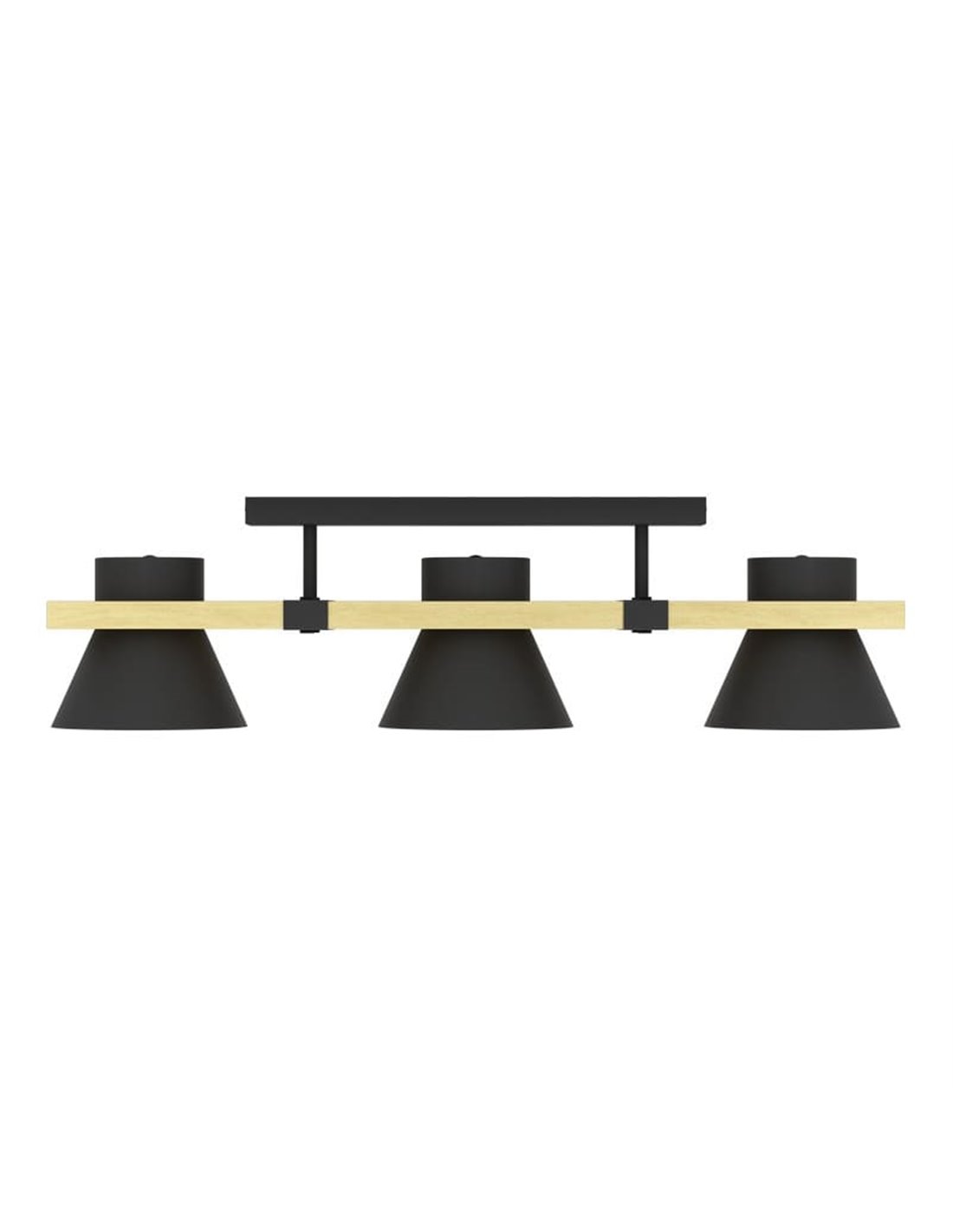 Die Deckenlampe MACCLES hat drei schwarze Metallschirme, die auf einem Fuß aus natürlichem Holz montiert sind. Abmessungen: ↕ 205 mm | ↔ 780 mm.
