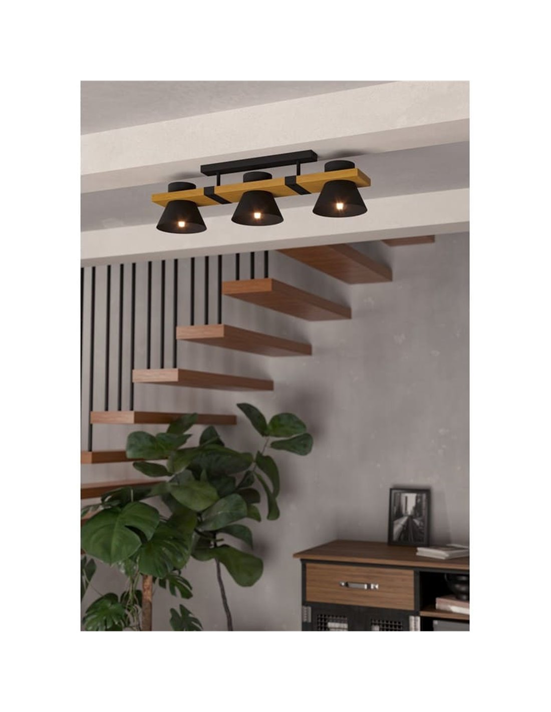 Die Deckenlampe MACCLES von Eglo kombiniert einen Fuß aus natürlichem Holz mit drei Schirmen aus schwarzem Stahl, wodurch ein industrielles Design entsteht, das sich perfekt in moderne Dekorationsstile einfügt. Ihre Materialkombination verleiht Ihren Räumen einen besonderen Akzent und sorgt für funktionale und dekorative Beleuchtung.