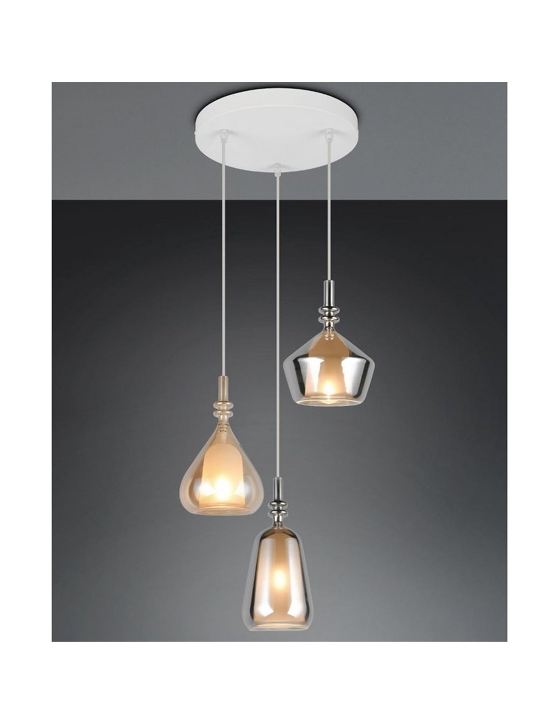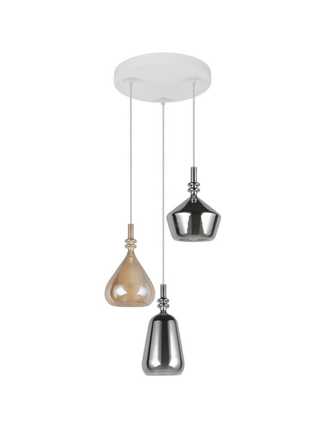 Die Deckenlampe ALDEA kombiniert Moderne und Eleganz in einem hängenden Design, das Licht und Charakter in jeden Raum bringt. Ihre drei Glasschirme in bernsteinfarbenem und verchromtem Finish reflektieren das Licht subtil und schaffen eine einladende und anspruchsvolle Atmosphäre. Die weiße Deckenbasis balanciert das Ganze und verleiht einen zeitgenössischen Akzent.