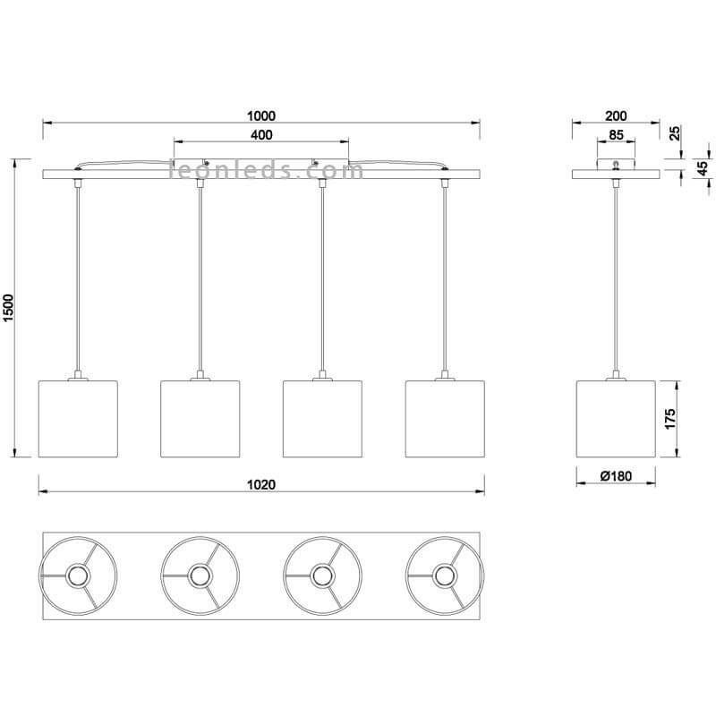 Diese Deckenlampe nordisch mit 4 Schirmen benötigt 4 LED-Birnen mit 'großem' E27-Sockel, wir empfehlen, 4 Birnen im G45-Format mit warmem Lichtton von 3000K und einer Leistung zwischen 4 und 7W je nach den Abmessungen des Tisches, der Installationshöhe oder, falls sie als allgemeine Beleuchtung installiert wird, die Abmessungen des Raumes zu berücksichtigen. Die Deckenlampe nordisch mit 4 Schirmen Elmau hat eine Länge von 102 cm, eine Höhe von bis zu 150 cm, die Sie an jedem der Schirme unabhängig regulieren können, eine Breite von 20 cm und einen Durchmesser des Schirms von 18 cm mit einer Höhe von 17,5 cm.