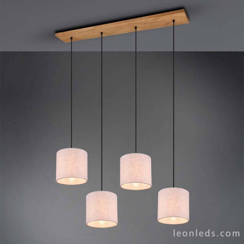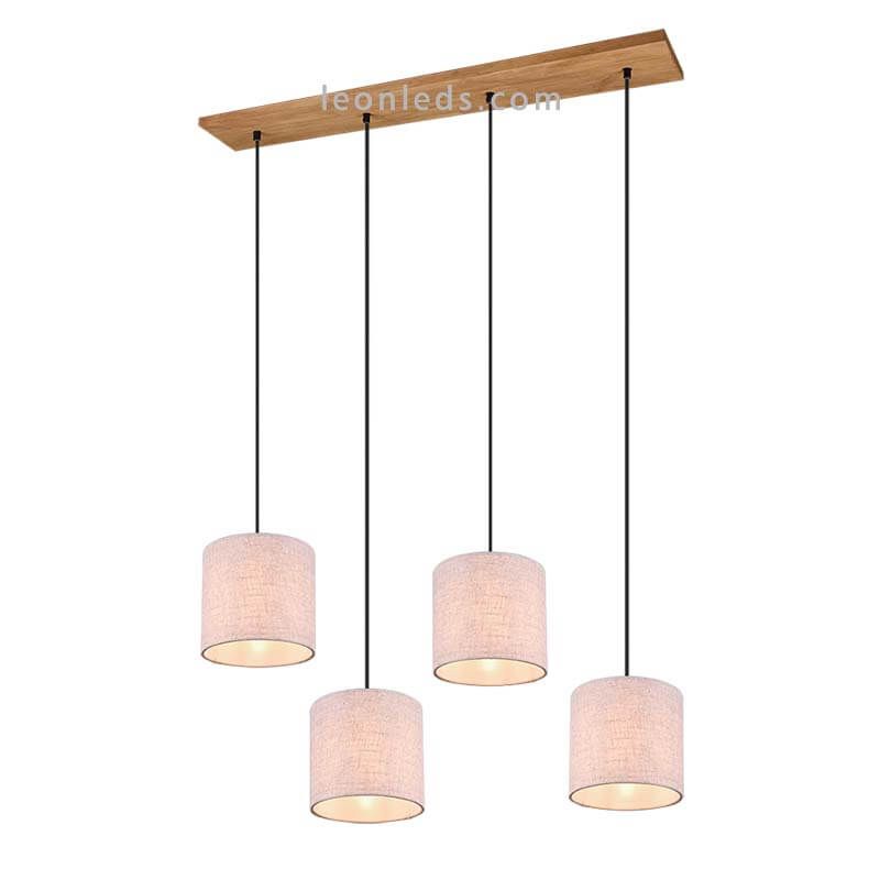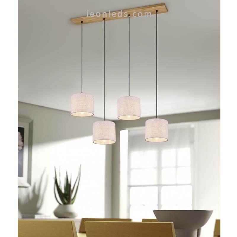 Deckenlampe nordisch mit 4 Schirmen aus der Kollektion Elmau, die 4 Schirme sind weiß und aus textilem Material gefertigt, einer von ihnen hat einen Durchmesser von 18 cm und eine Höhe von 17,5 cm, die Höhe kann unabhängig bis zu maximal 150 cm reguliert werden, das Kabel, das sie hält, ist aus schwarzem Textil und die Deckenbasis ist aus rechteckigem Holz gefertigt. Wenn Sie eine hängende Lampe im nordischen Stil suchen, um einen Tisch oder einen Tresen zu beleuchten, ist diese nordische Deckenlampe die ideale Wahl, perfekt für Räume, in denen helle Farben und Stile wie nordisch oder ibizenkisch vorherrschen, zudem können Sie sie in einem gemeinsamen Raum mit der anderen Deckenlampe kombinieren, die Teil der Kollektion Elmau ist.