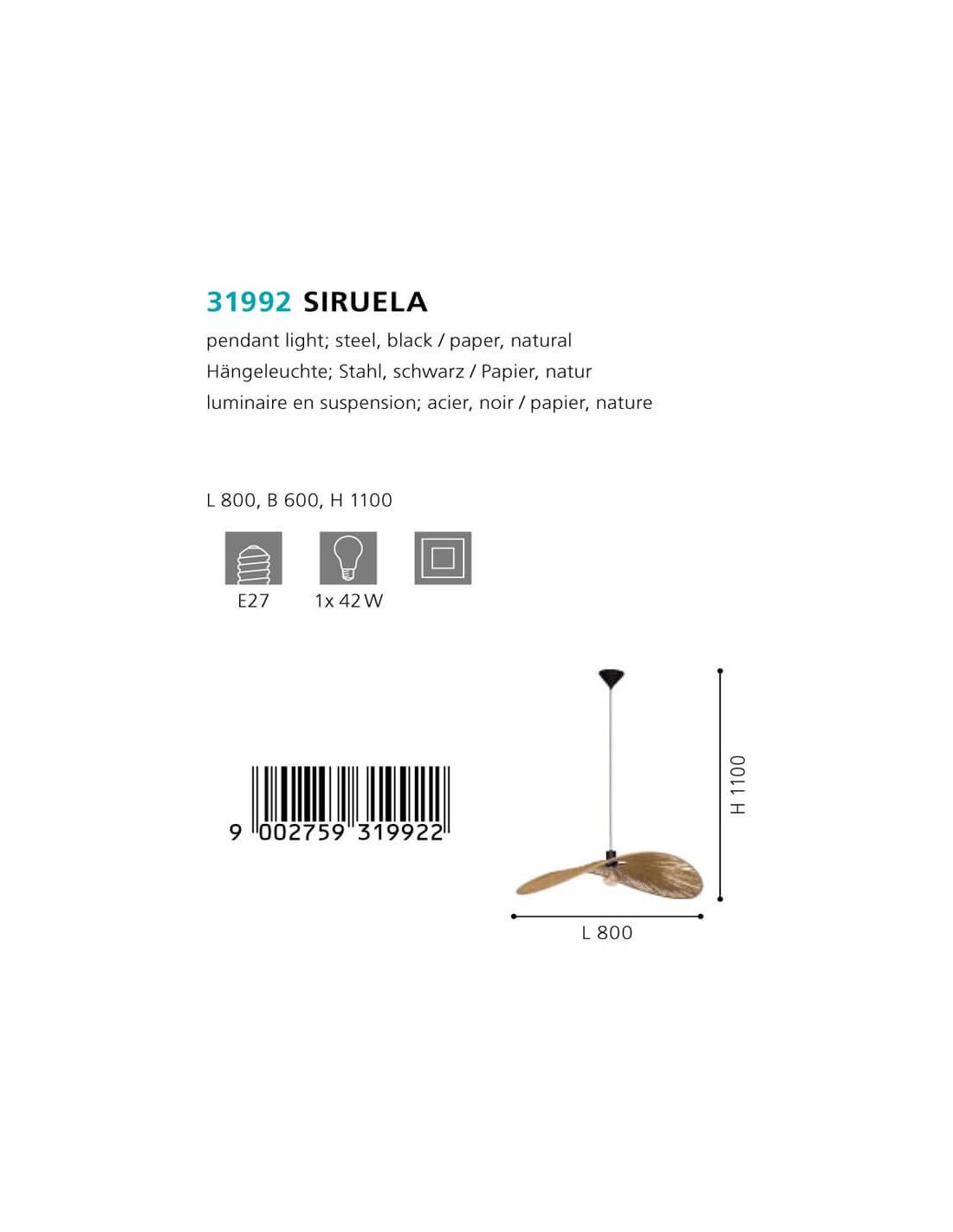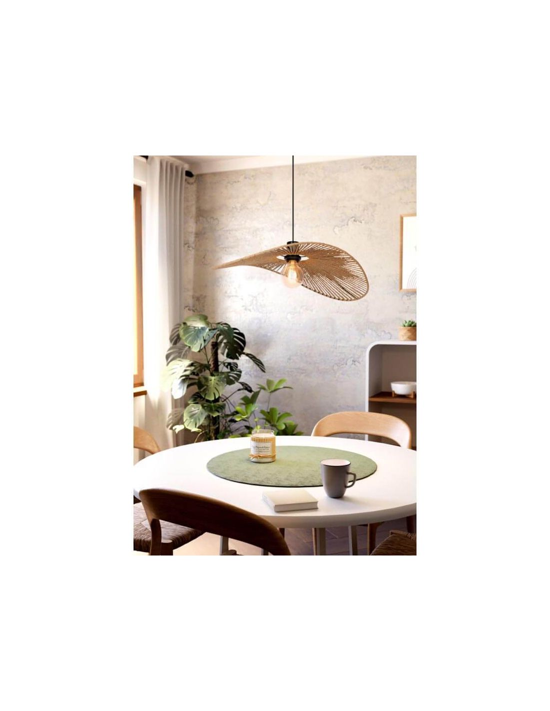 Die Deckenlampe Pamela mit 80 cm Durchmesser aus der Kollektion Siruela besticht durch ihr elegantes und natürliches Design. Mit einem Durchmesser von 80 cm besteht diese Lampe aus FSC-zertifiziertem Papier, das die natürliche Faser imitiert und jedem Raum eine warme und einladende Atmosphäre verleiht. Ihr schwarzes Stahlgestell bietet einen modernen und raffinierten Kontrast, ideal für Wohnzimmer, Esszimmer oder jeden Raum, in dem eine entspannende und zugleich zeitgenössische Atmosphäre gewünscht wird.