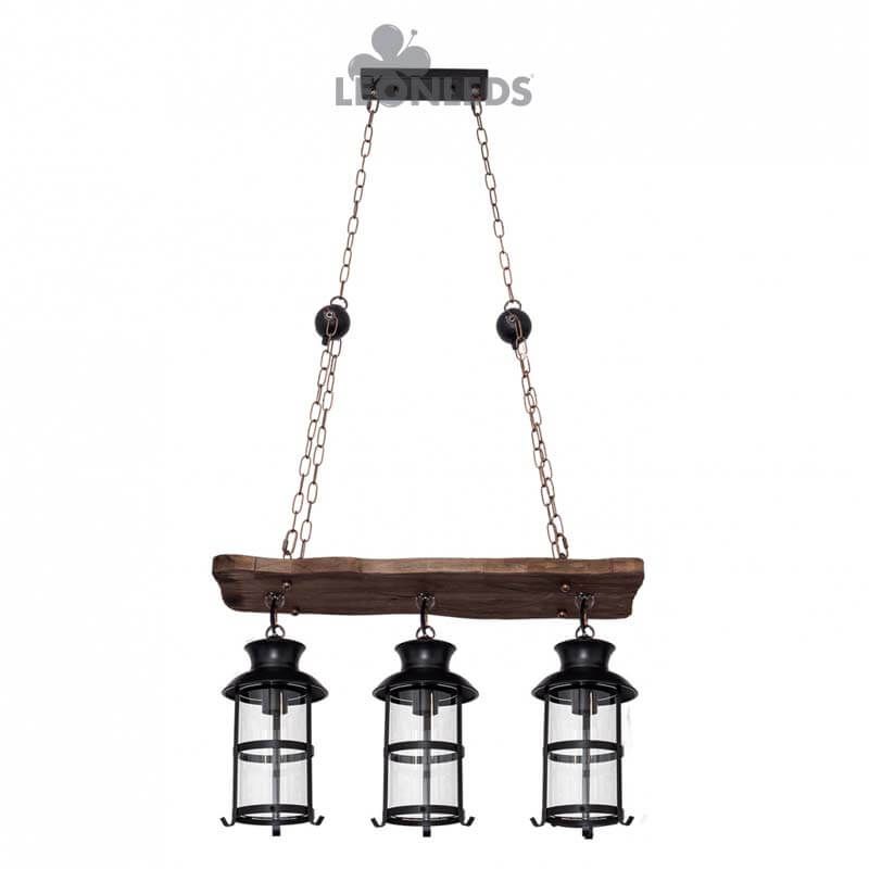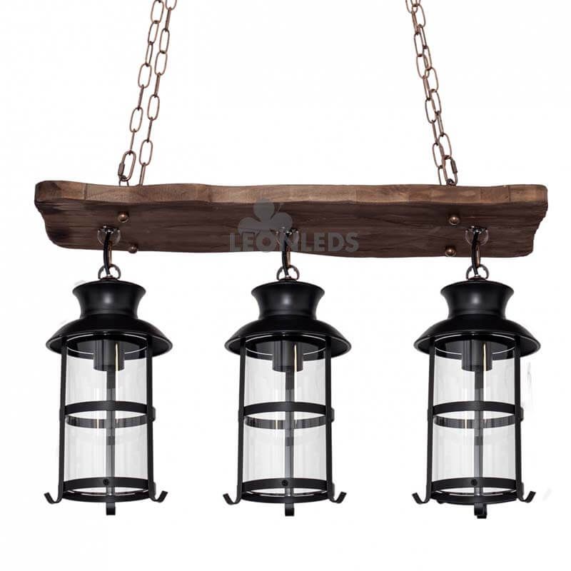 Rustikale Deckenlampe aus Holz, Metall und Glas aus der Kollektion Cortijo, die Basis der Decke und die drei Schirme sind schwarz und die Basis, von der sie hängen, ist aus Holz. Zur Beleuchtung benötigen Sie 3 LED-Lampen mit E27-Fassung, die nicht enthalten sind. Wir empfehlen, Vintage-Glühbirnen im „Filament“-Stil mit warmem Lichtton zu installieren, um diese Lampe zu betonen, da der gelbe „warme“ Lichtton ideal für den rustikalen Stil ist. Ihr Design wird perfekt zu jedem Dekorationsstil passen, sei es Vintage oder Rustikal, das Endergebnis wird dank dieser Lampe spektakulär sein, sie wird das zentrale Element des Raumes sein.
